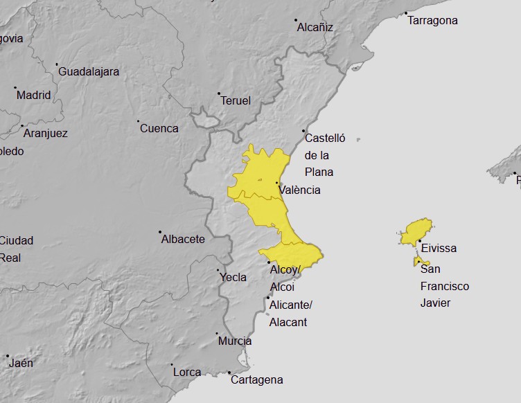 - A partir de la 20 horas este aviso amarillo se amplía también a la costa de Valencia, con lo que quedará toda la provincia de Valencia en aviso amarillo y se amplía a la costa norte de Alicante.