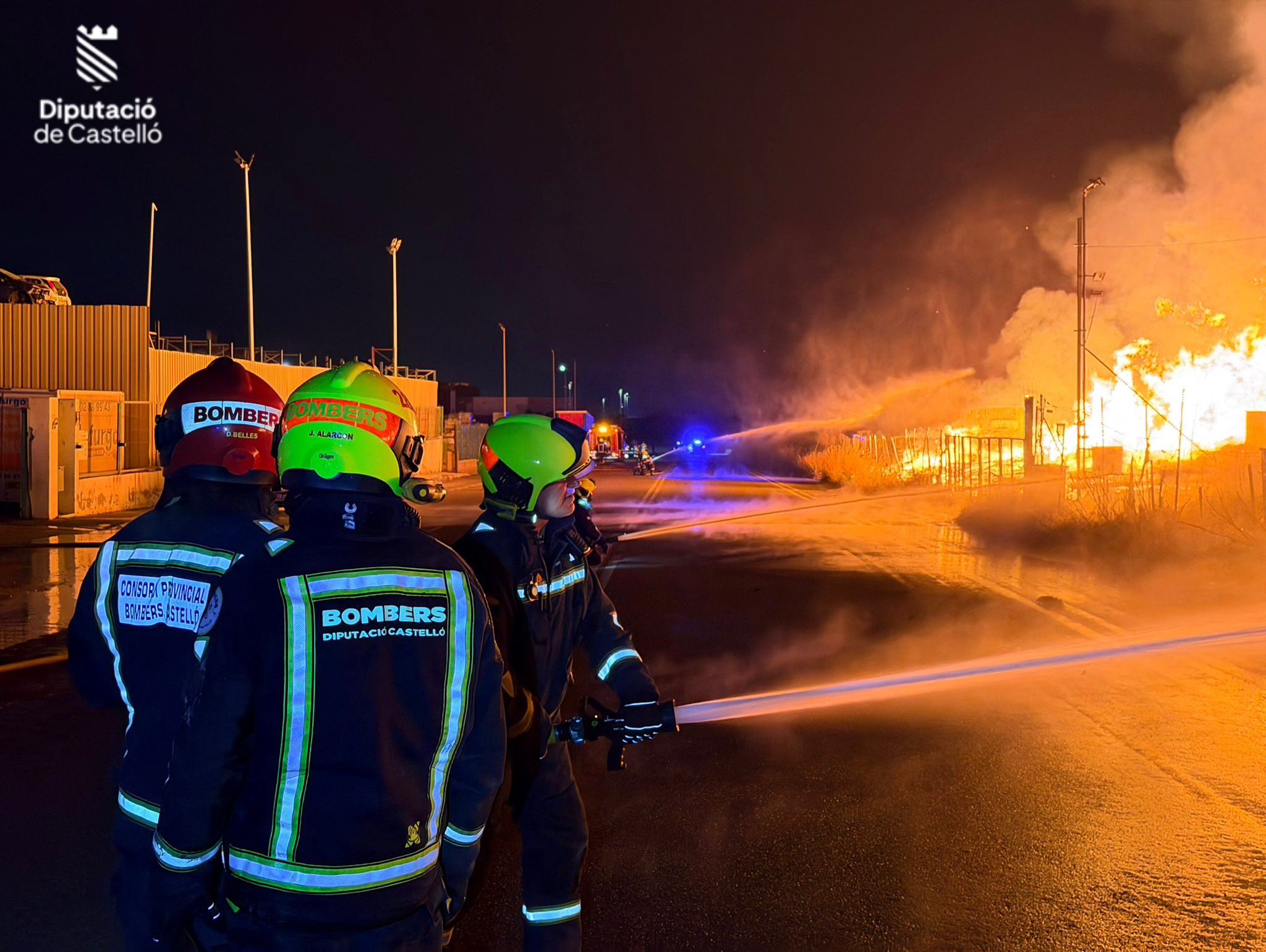 Durante toda la noche, los efectivos de los parques de la Plana Baixa, Espadà-Millars y voluntarios de Onda han trabajado sin descanso. El objetivo era claro: contención y protección. Mientras una parte del dispositivo se centraba en tratar de sofocar el foco principal en la planta de madera, el grueso de los recursos se destinó a crear un «muro de agua» para proteger las instalaciones críticas del desguace vecino.