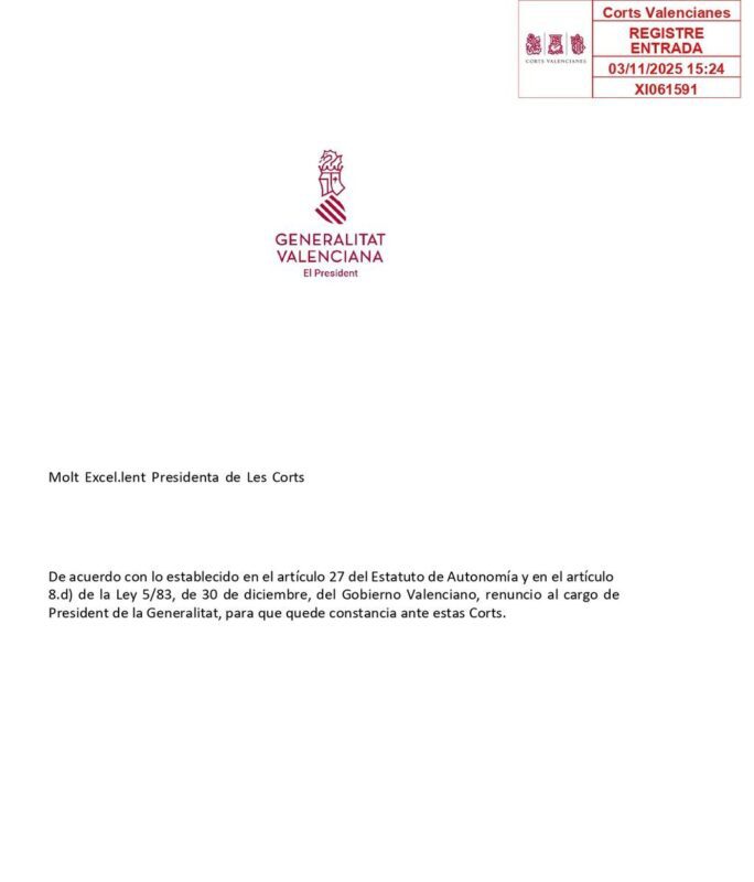 En el escrito, dirigido a la presidenta de las Corts, Llanos Massó, Mazón señala: “De acuerdo con lo establecido en el artículo 27 del Estatuto de Autonomía y en el artículo 8.d) de la Ley 5/83 del Gobierno Valenciano, renuncio al cargo de president de la Generalitat, para que quede constancia ante estas Corts”.