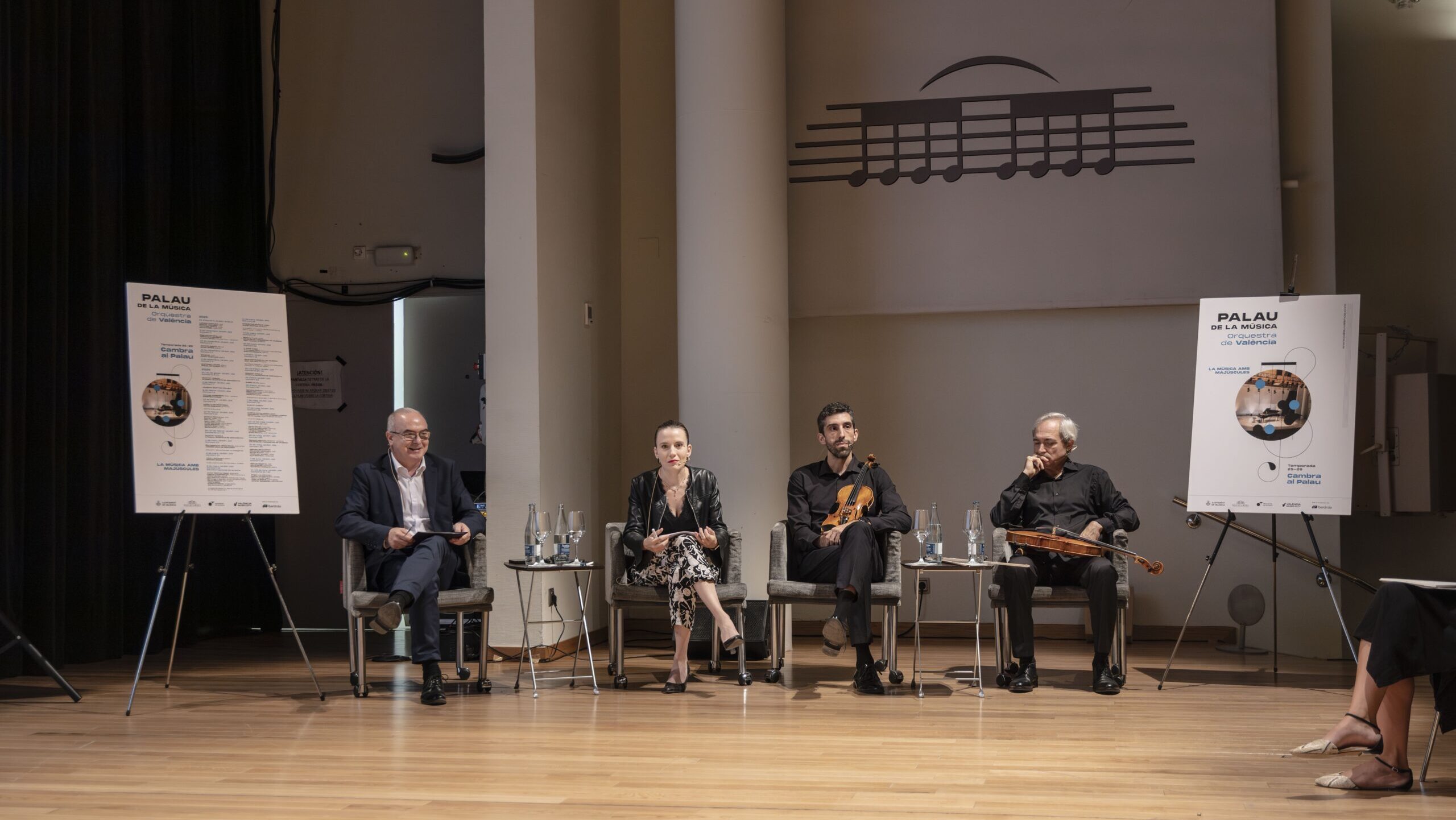 El director del Palau de la Música de Valencia, Vicente Llimerá; la subdirectora de Música, Nieves Pascual y los profesores de la Orquesta de Valencia, Luciano Casalino y Santiago Cantó, han presentado a los medios de comunicación la nueva edición del veterano ciclo “Cambra al Palau” del auditorio valenciano. Precisamente, Luciano Casalino y Santiago Cantó, junto con Manuel Segarra y David Forés, iniciarán mañana miércoles el ciclo con un concierto gratuito, basado en obras de Schubert, Beethoven y el compositor residente en la presente temporada José María Sánchez-Verdú.