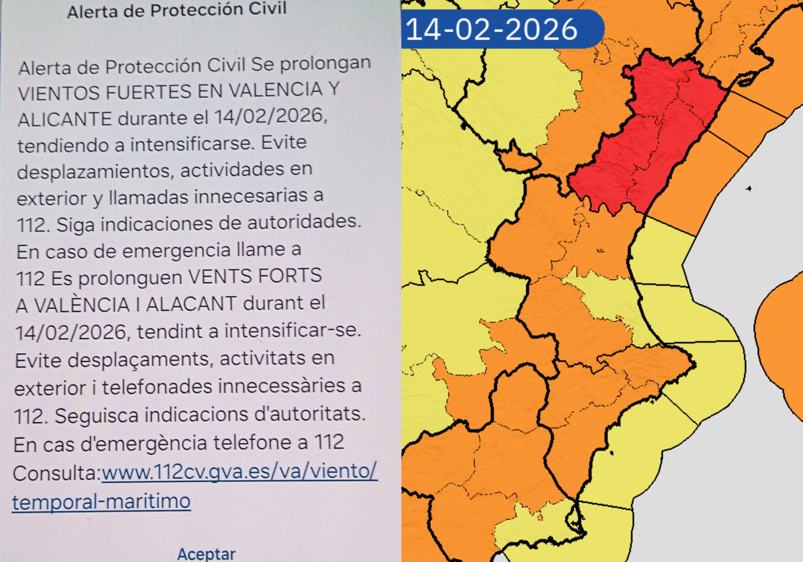 Se prolongan vientos FUERTES en Valencia y Alicante durante el 14/02/2026 tendiendo a intensificarse. Evite desplazamientos, actividades en exterior y llamadas innecesarias al 112. Siga las indicaciones de las autoridades. En caso de Emergencia llame al 112.