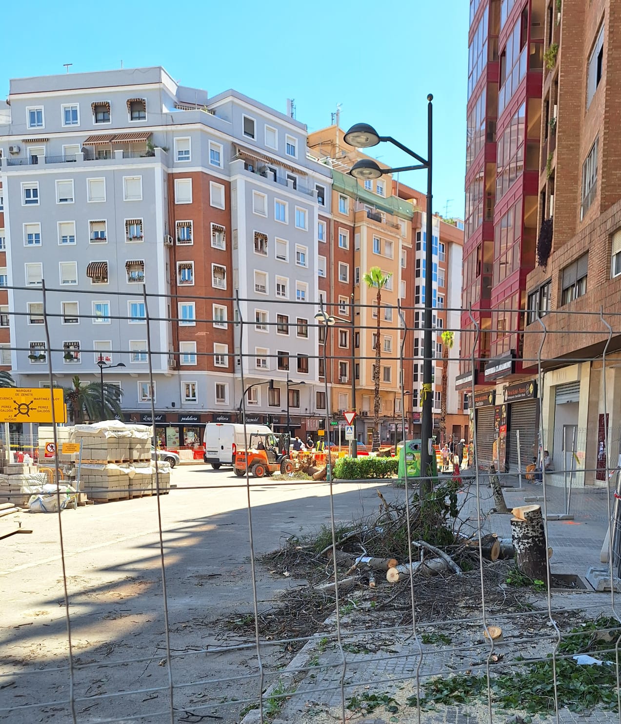 A unos centenares de metros, en la puerta de la antigua estación de tren de Giorgeta, los materiales de obras están dañado otro de los ficus y ya han arrasado con parte de la jardinería. La pregunta es clara, ¿las constructoras prefieren eliminar el arbolado anterior porque sale más barato talar y sustituir por uno nuevo?. Una pregunta en el aire que muchos se hacen , pero la realidad es que tardarán años en volver a dar sombra y realizar su función de purificador de aire.