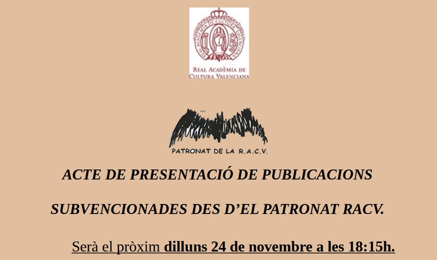 Serà el pròxim dilluns 24 de novembre a les 18:15h. en el Saló d’Actes de la Real Acadèmia de Cultura