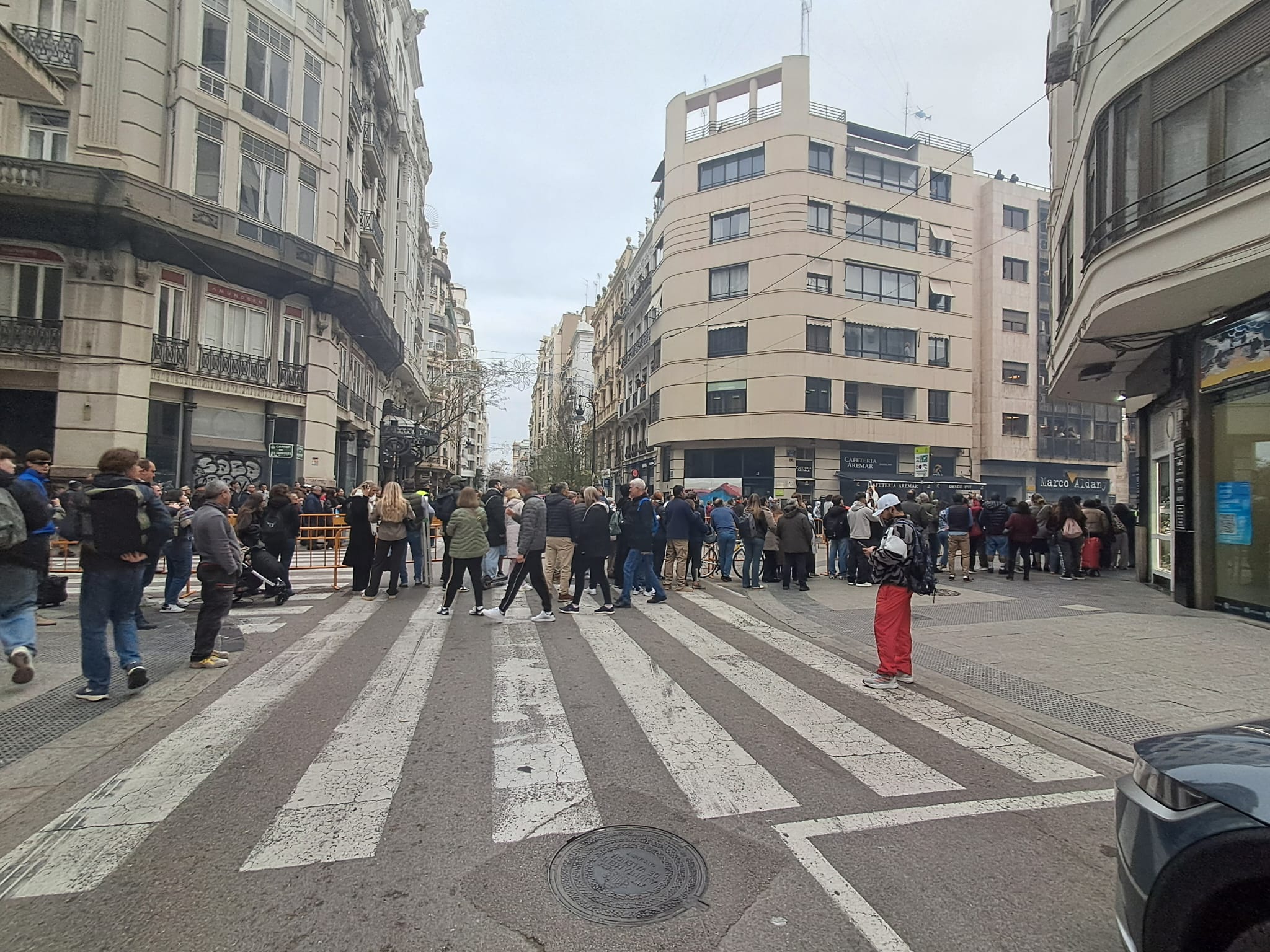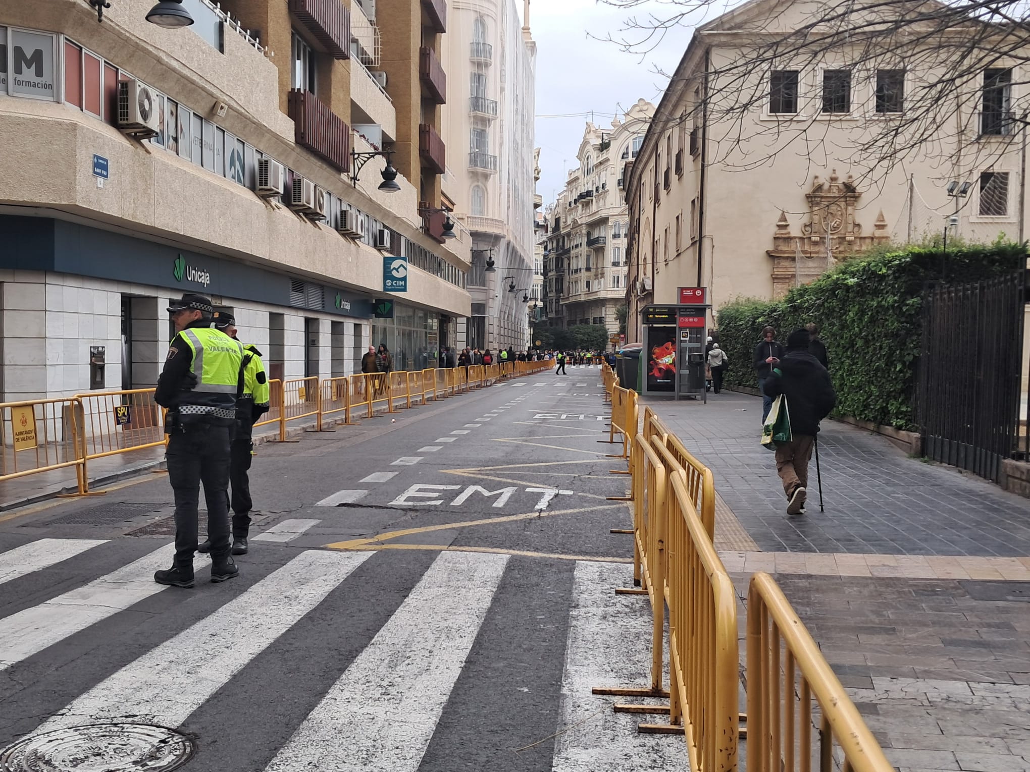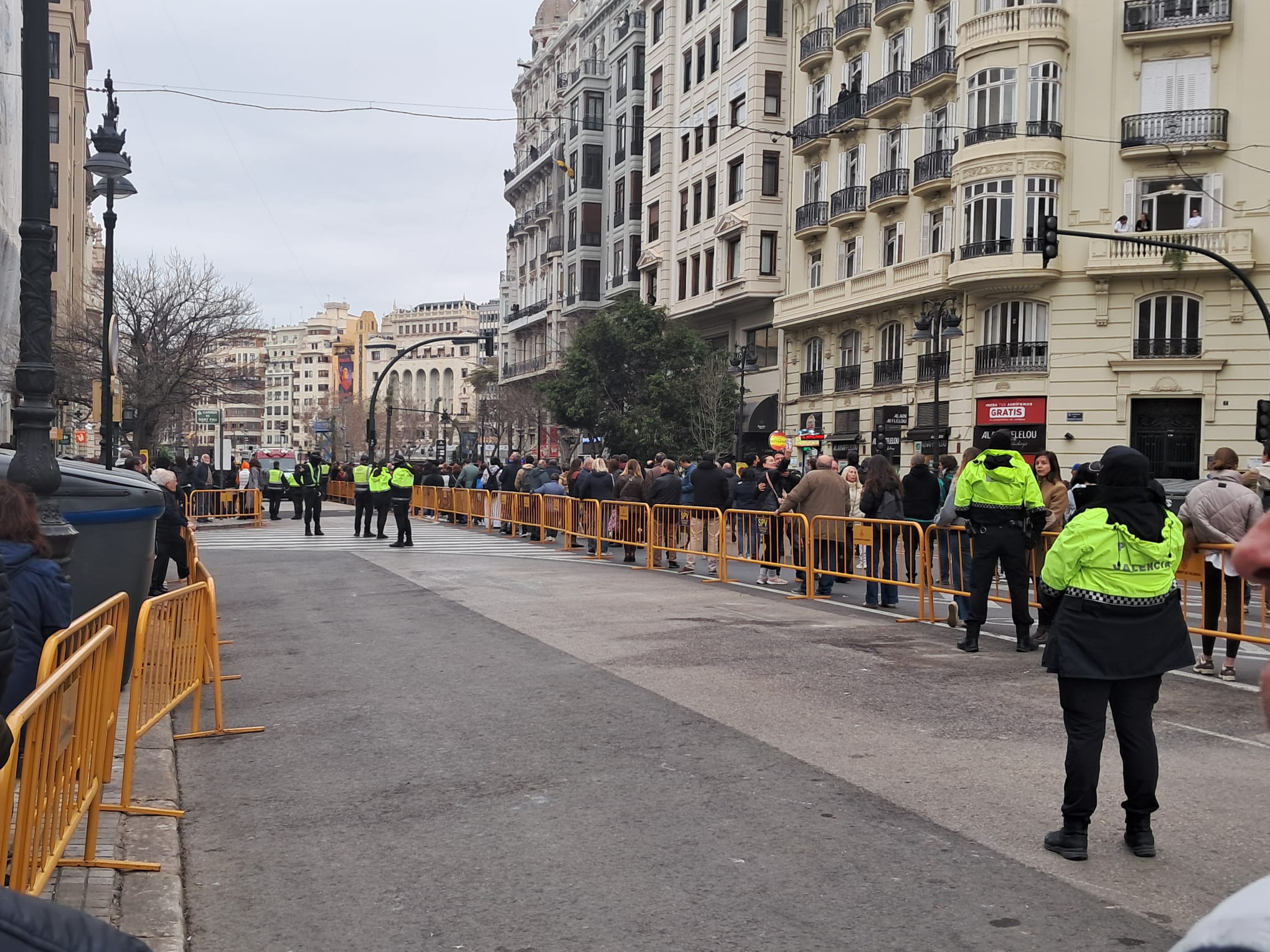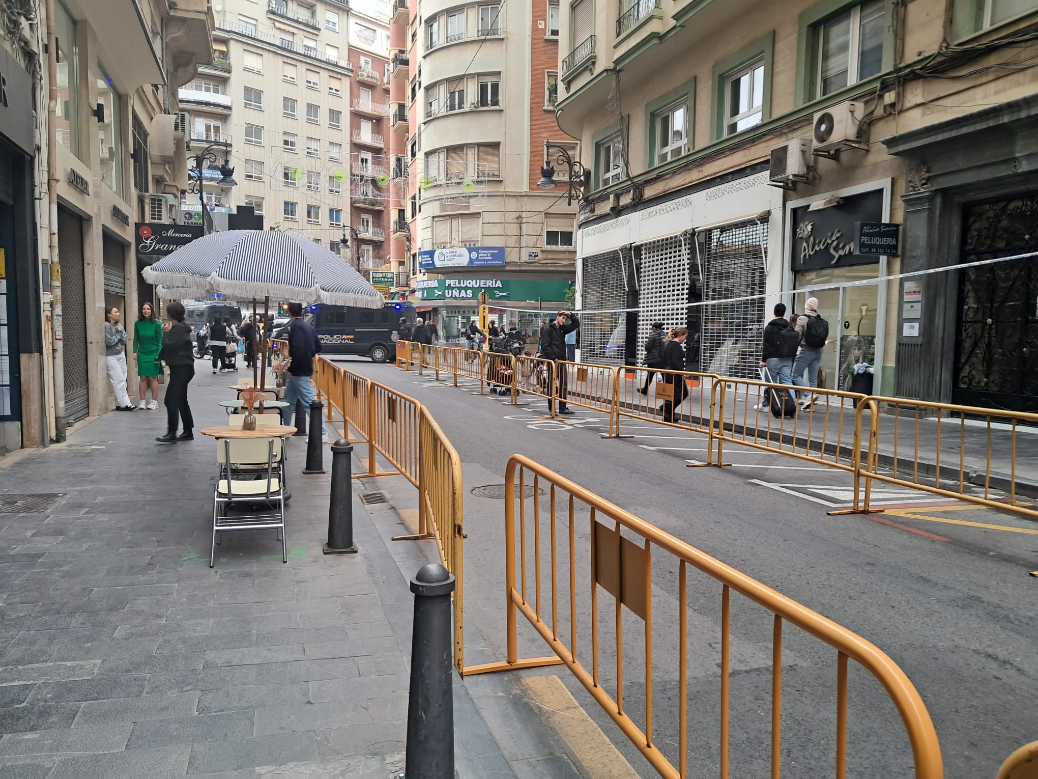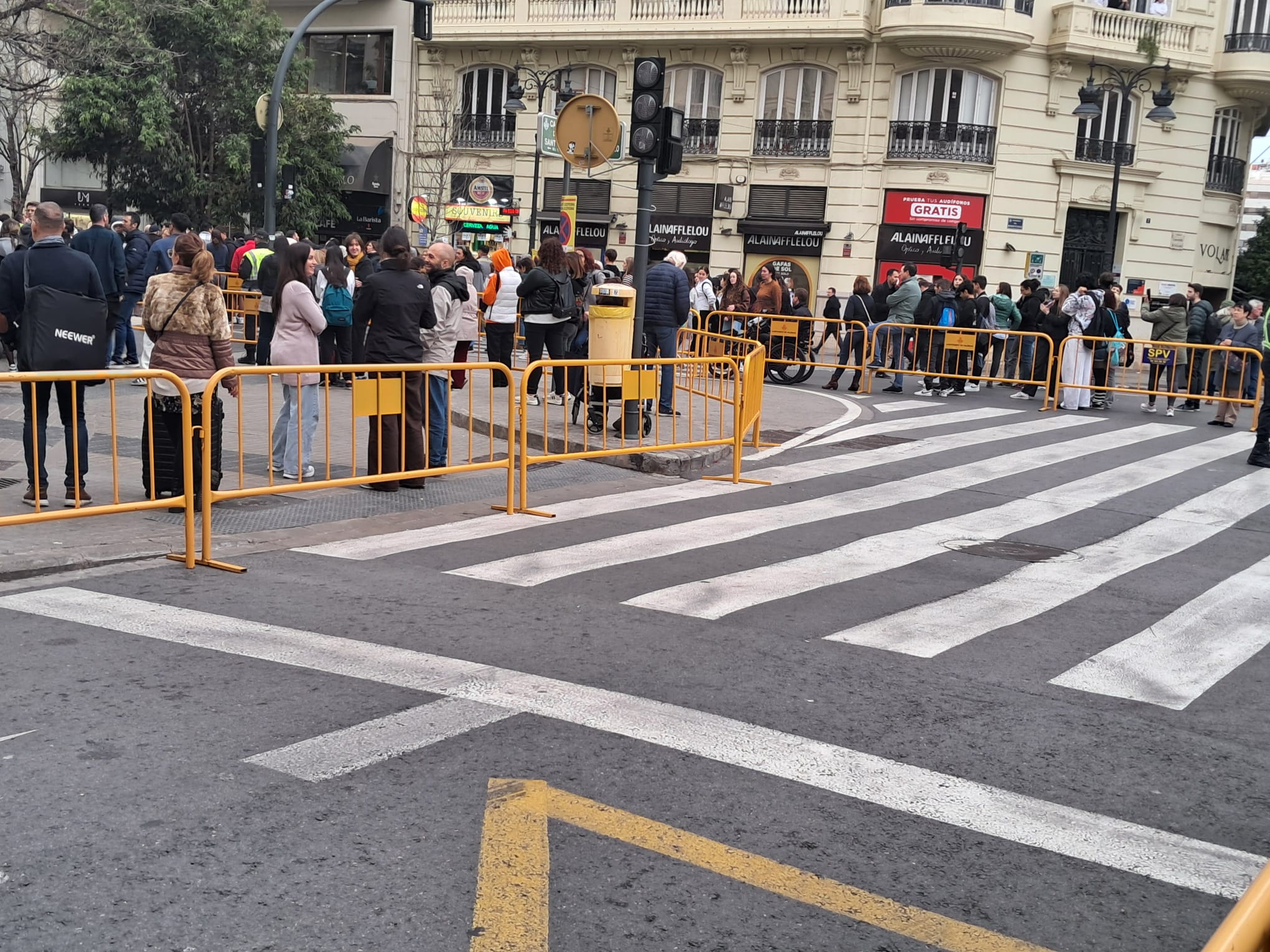 Este año han aumentado las espacios denominados como vías de evacuación de emergencia en torno a las mascletaes, pero se están produciendo situaciones absolutamente sin sentido alguno que han restado cerca de 10.000 personas el aforo de la propia plaza del Ajuntament y de las calles aledañas, produciéndose nuevas situaciones y sinsentidos como el de la foto, con la calle Sangre y Garrigues valladas como vía de evacuación hasta la Avenida del Oeste y junto a las vallas mesitas de una terraza mientras se dispara la mascletà.