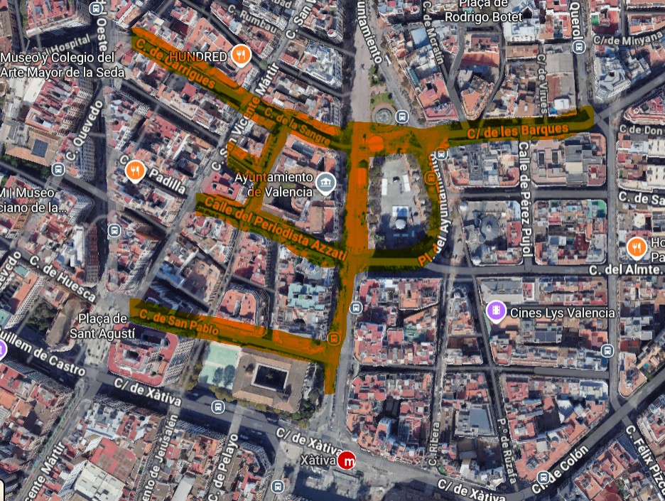- La propia Marqués de Sotelo se valla desde la calle Periodista Azzati hasta la puerta del IES Luis Vives, conectando con la calle de San Pablo, ocupando media calzada.
