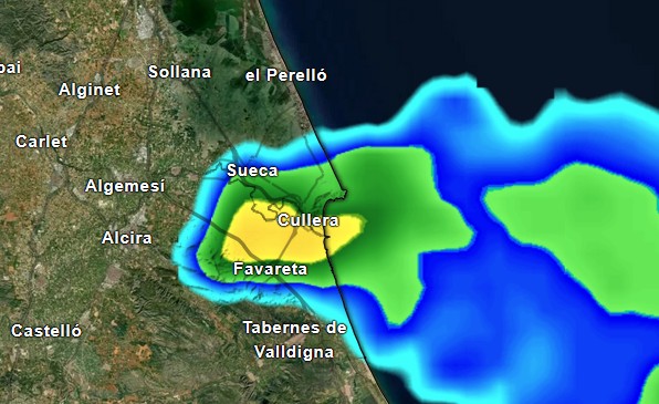 Un núcleo de precipitación ha descargado la última hora en Favara y el Sur de Cullera, por debajo de la desembocadura del Júcar. En la última hora se ha acumulado 21 litros de precipitación en Favara y 15 en la zona del Marenyet de Cullera.
