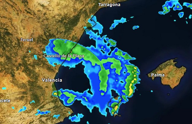 En la última hora un núcleo muy activo se ha desgajado de la gran tormenta que se sitúa en el Golfo de Valencia y que llega desde Tarragona al Cao de la Nao y hasta Palma y que envía lluvia hacia Castelló, donde la lluvia ya penetra hasta en el interior norte.