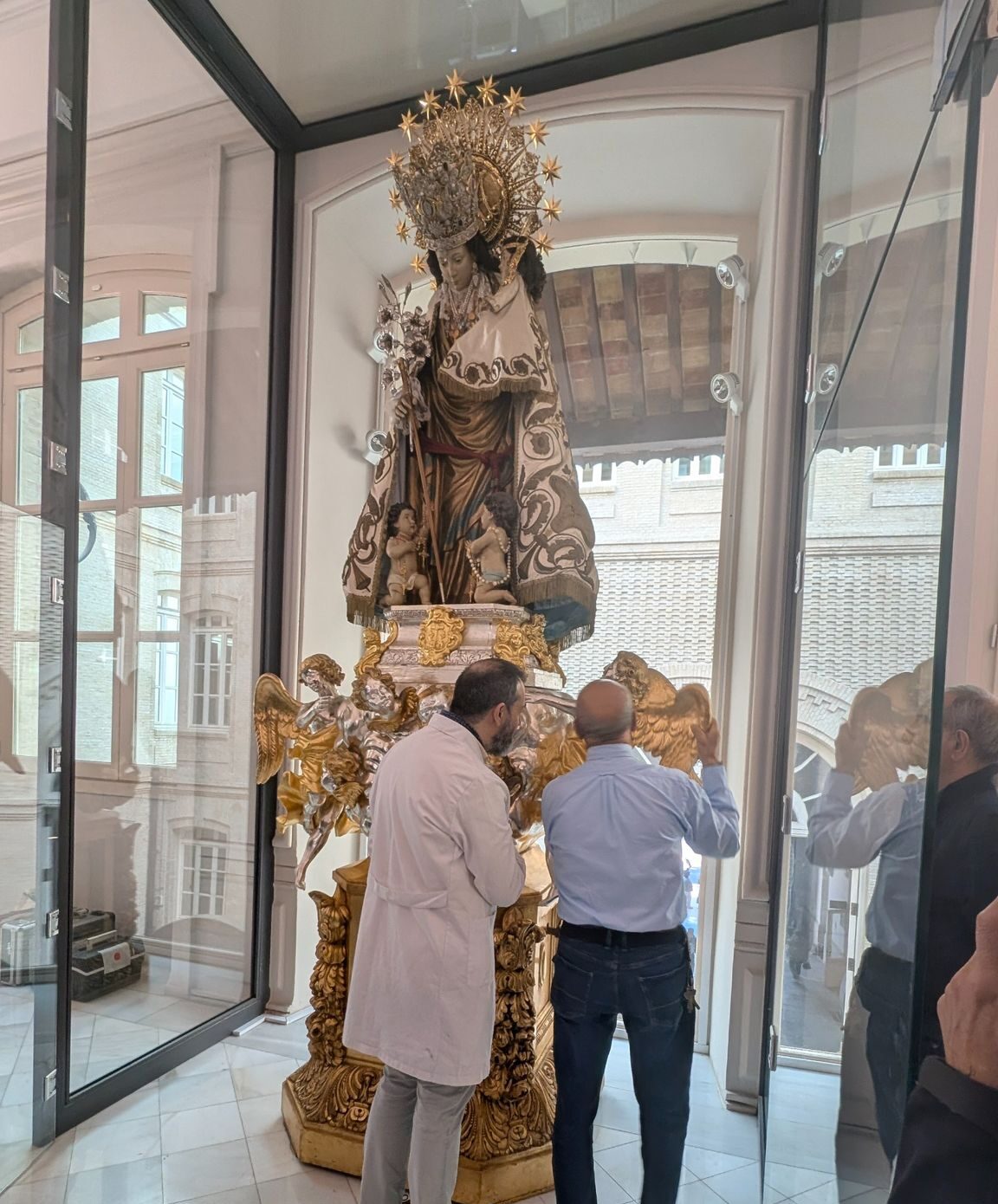 «Miembros de la Cofradía y de la Hermandad de los Seguidores de la Virgen han supervisado hoy el estado de la imagen y puesto a punto cada detalle, como el pelo o el manto, para garantizar que se encuentre en perfectas condiciones para el reencuentro con los fieles».