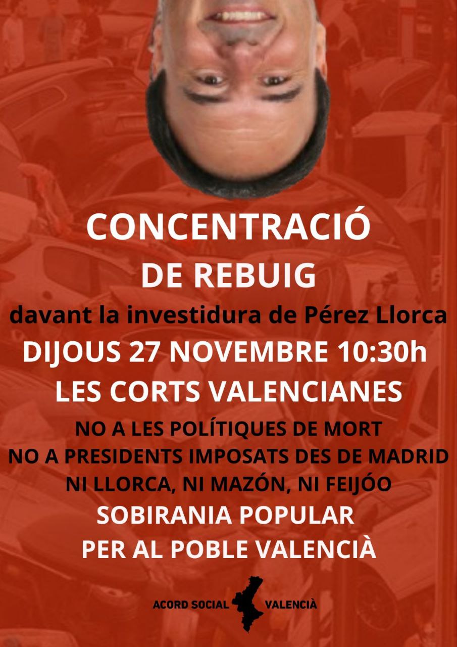 La jornada de investidura de Juan Francisco Pérez Llorca como presidente de la Generalitat Valenciana se anuncia con un creciente clima de tensión social. Diversos colectivos han convocado una protesta frente a Les Corts Valencianes que pretende visibilizar el rechazo popular ante las líneas políticas del candidato y sus alianzas parlamentarias.