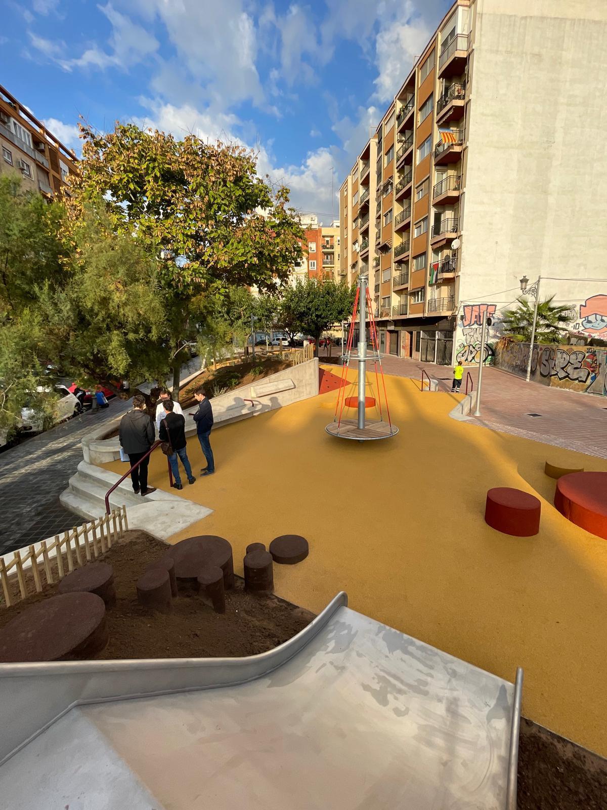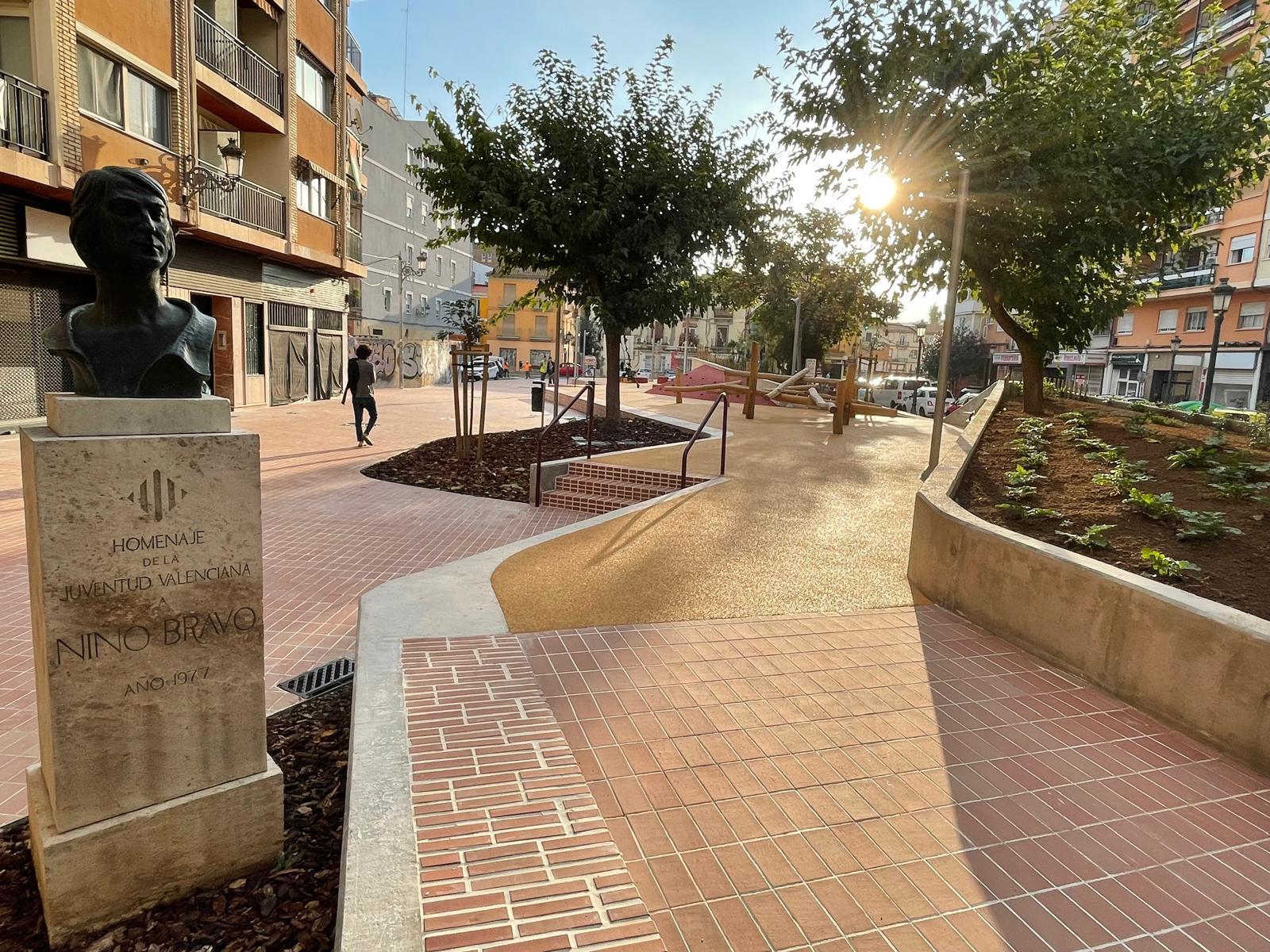 - Junio-Octubre 2025: Ejecución y finalización Las máquinas entran en junio, cinco años después de la idea inicial. Se peatonaliza plenamente el entorno (cerca de la iglesia y el asilo de Hermanitas de los Ancianos Desamparados), se elimina el vial norte y lateral para ganar espacio familiar, y se integra con la calle Sagunto. La remodelación integral transforma el «jardín escondido e infrautilizado» en una plaza peatonal con zona verde amplia, juegos renovados y accesibles, y el busto reubicado prominentemente.