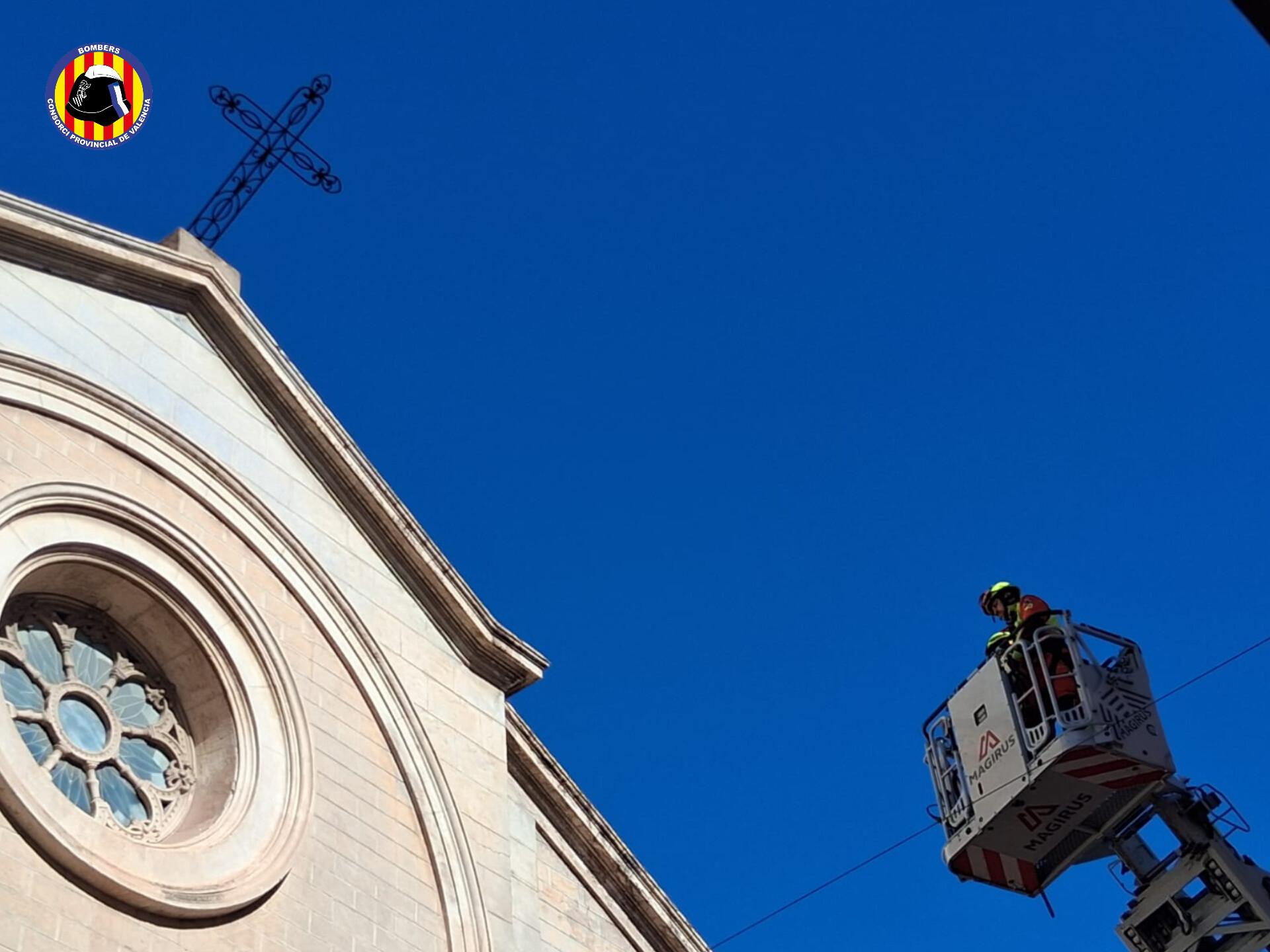 Los bomberos retiran la cruz de la iglesia de l’Alqueria de la Comtessa ante el riesgo de caída por el fuerte temporal
