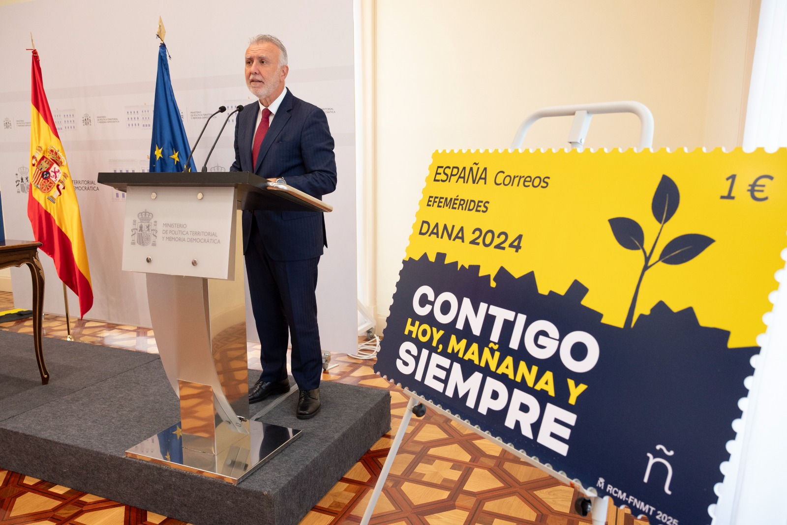 El ministro de Política Territorial y Memoria Democrática, Ángel Víctor Torres, ha presentado hoy, junto a la comisionada epara la Dana, Zulima Pérez, y el presidente de Correos, Pedro Saura, el sello que homenajea a las víctimas de la DANA 2024 con el lema “Contigo hoy, mañana y siempre”.