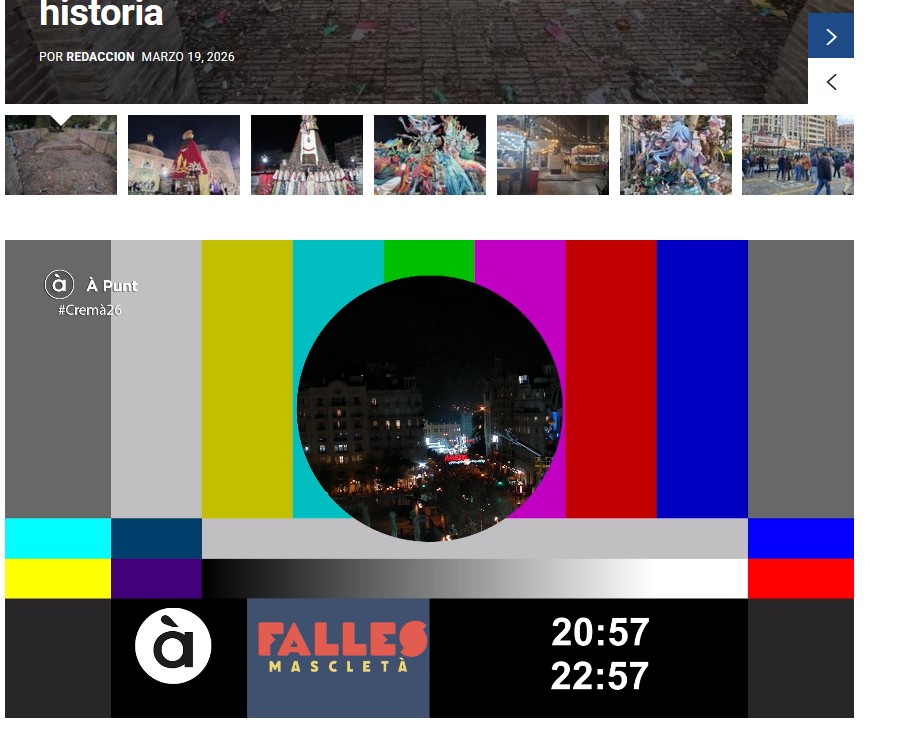 En la home del diario, que ha dado en directo les masletaes de la Catedral de la Pólvora, las 19 del rito festivo fallero del Cap i Casal, conectaremos nuevamente con el Ajuntament de Valencia para ver la cremà de la Falla Infantil municipal, que será la última en arder según la tradición y finalmente la cremà del Charles Chaplin.
