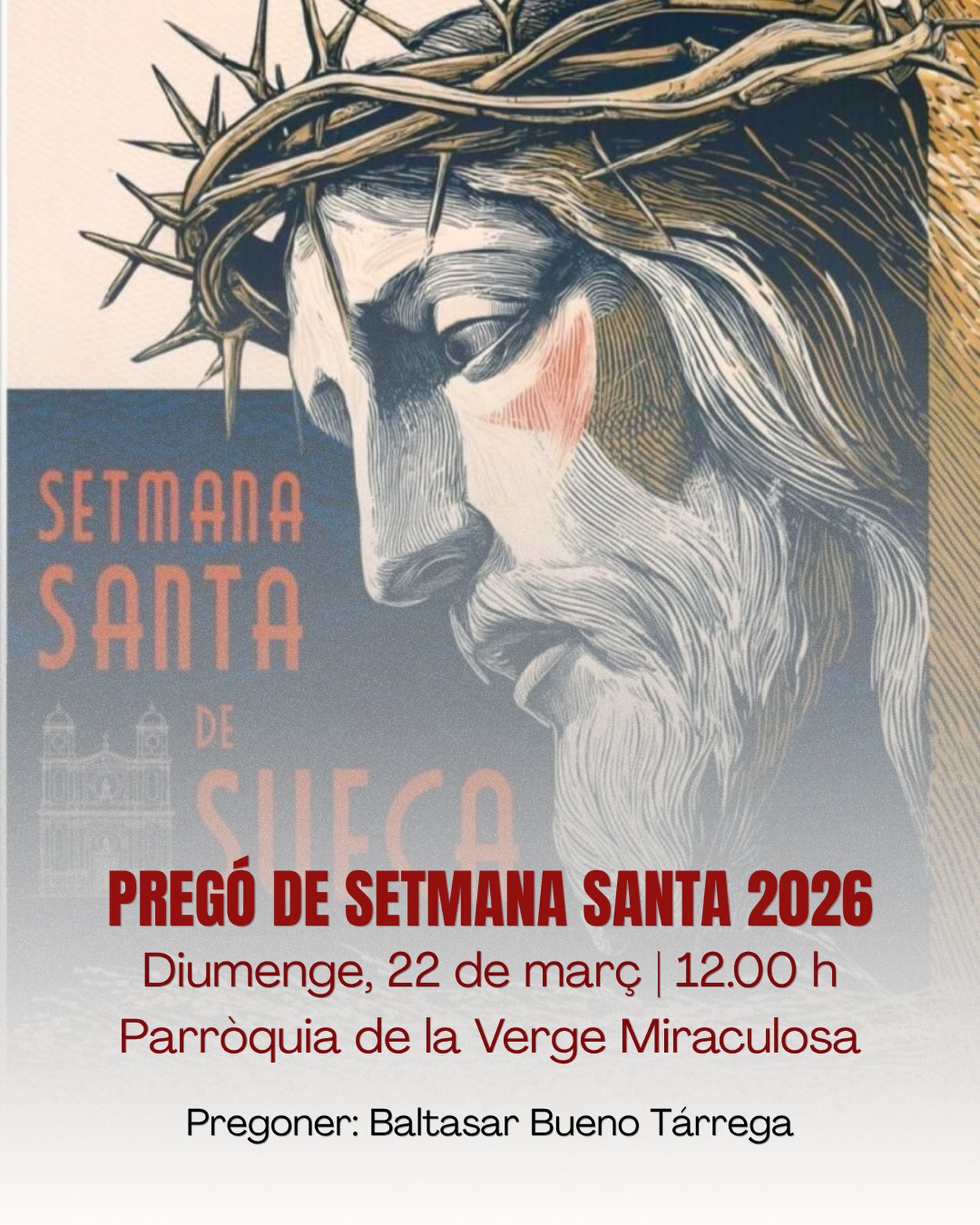 SUECA | 22/03/2026 – La ciudad de Sueca ha iniciado oficialmente el camino hacia su Semana Santa. En una mañana marcada por la luz primaveral y el sonido de las campanas, la Parroquia de la Virgen Milagrosa se convirtió en el epicentro del sentimiento cofrade. A las 12:00 horas, bajo una atmósfera de respetuoso silencio y expectación, el periodista y escritor Baltasar Bueno Tárrega pronunció el Pregón que abre las puertas a unos días donde la tradición, el arte y la devoción inundarán cada rincón de la localidad.
