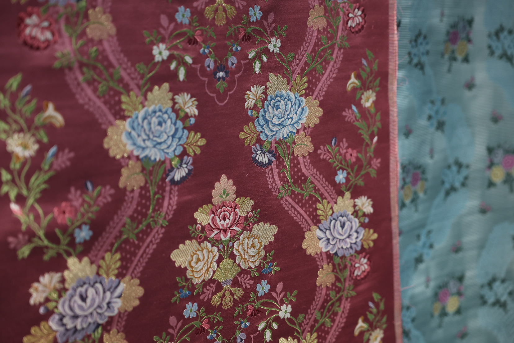 El tejido del segundo traje oficial lleva por nombre «TOURELLE». Un dibujo de finales del siglo XVIII que recupera la esencia más delicada de la seda valenciana. Se trata de una valencianita con fondo otomán, donde los centros pequeños y asimétricos se distribuyen con equilibrio y sutileza, creando un efecto visual lleno de encanto. Un