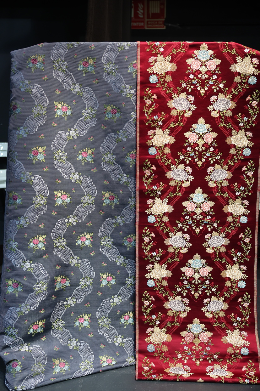 El primer traje se trata de un estrecho de seda de nombre ‘SANTA MARTA’, un diseño creado especialmente para la ocasión y que rinde homenaje a la tradición sedera valenciana. Su composición destaca por un centro enmarcado con metal oro, rodeado de una delicada combinación de flores grandes y pequeñas que se entrelazan en perfecta armonía. La orla, de gran movimiento y riqueza ornamental, aporta dinamismo al conjunto, mientras los diferentes efectos del metal dan una sutil y elegante luz al tejido, reflejo del cuidado y la maestría de los telares de Compañía Valenciana de la Seda.