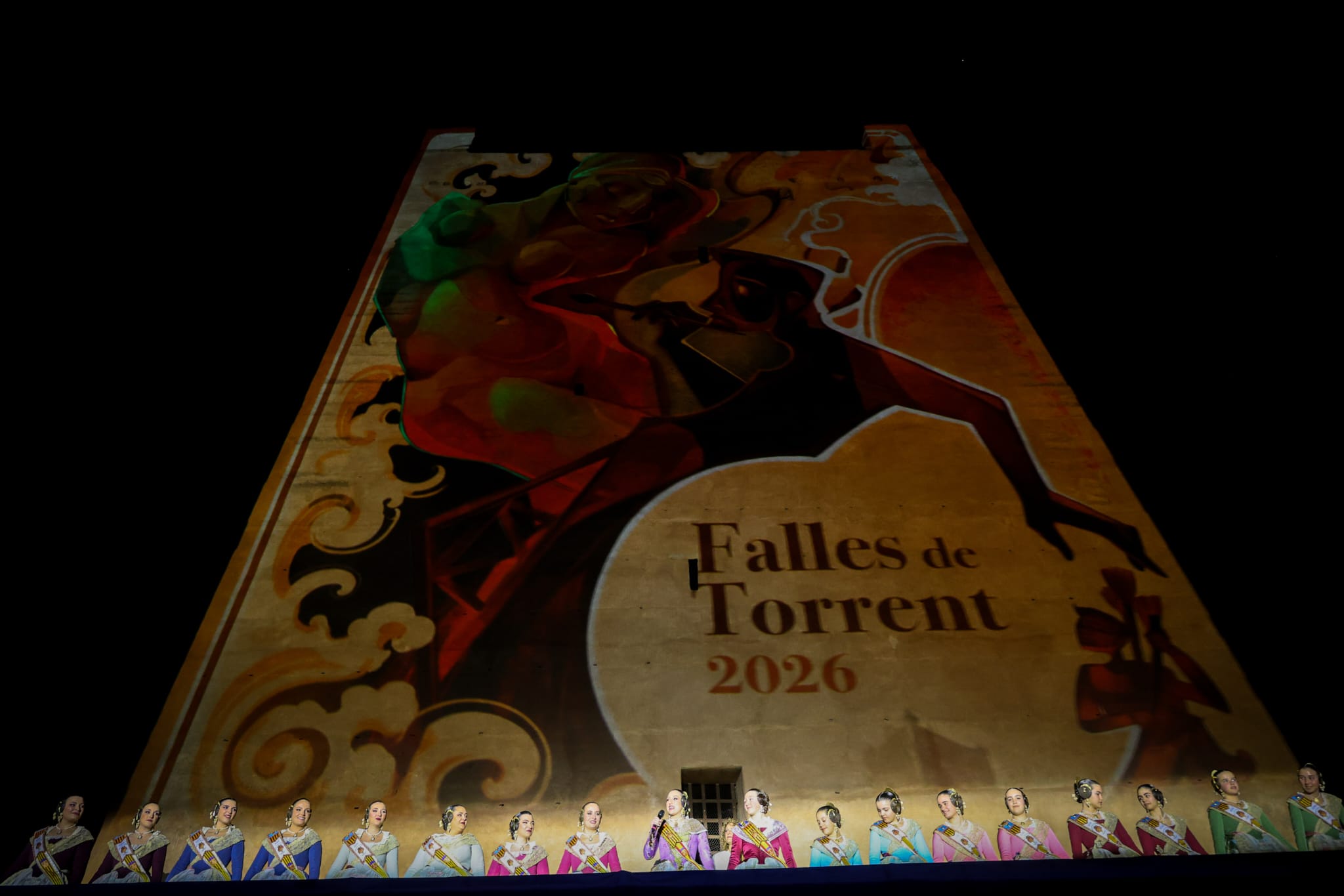 El acto central arrancó a las 20:00 horas con un ambicioso videomapping conmemorativo. Proyectado sobre la piedra de la Torre, el audiovisual realizó un viaje emocional por las 50 Crides celebradas entre 1976 y 2026, rescatando imágenes de todas las Falleras Mayores de la historia de Torrent.
