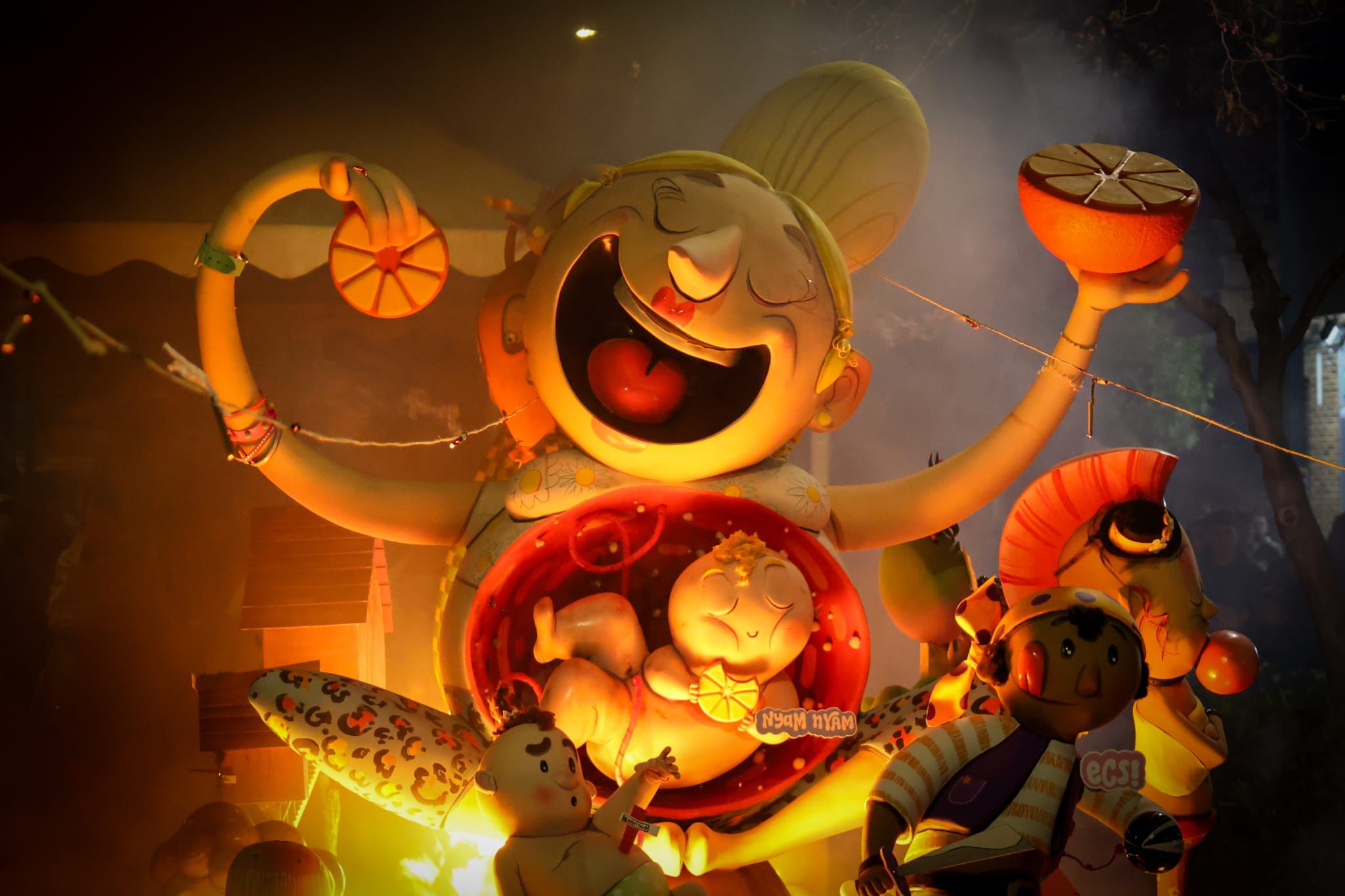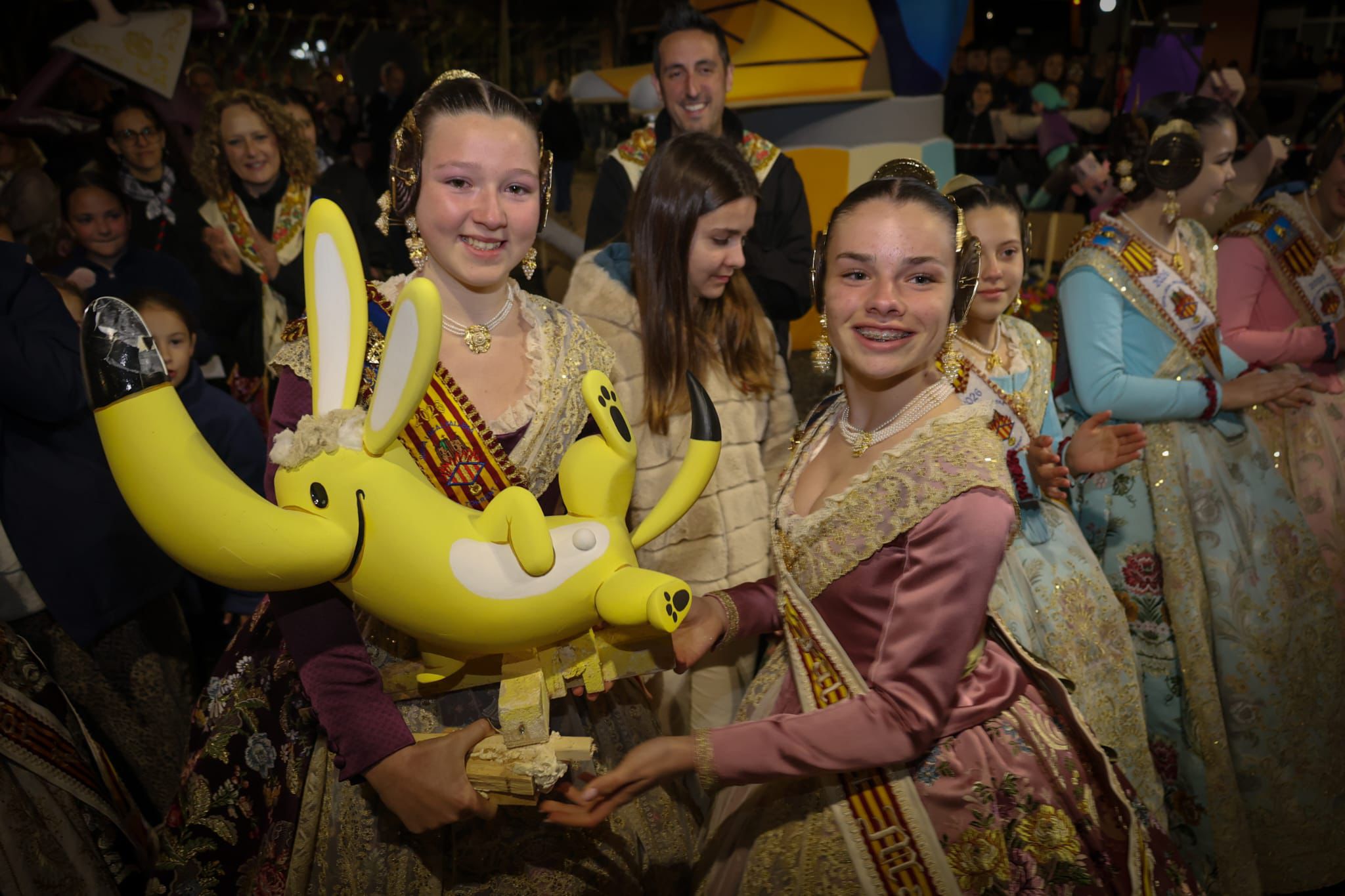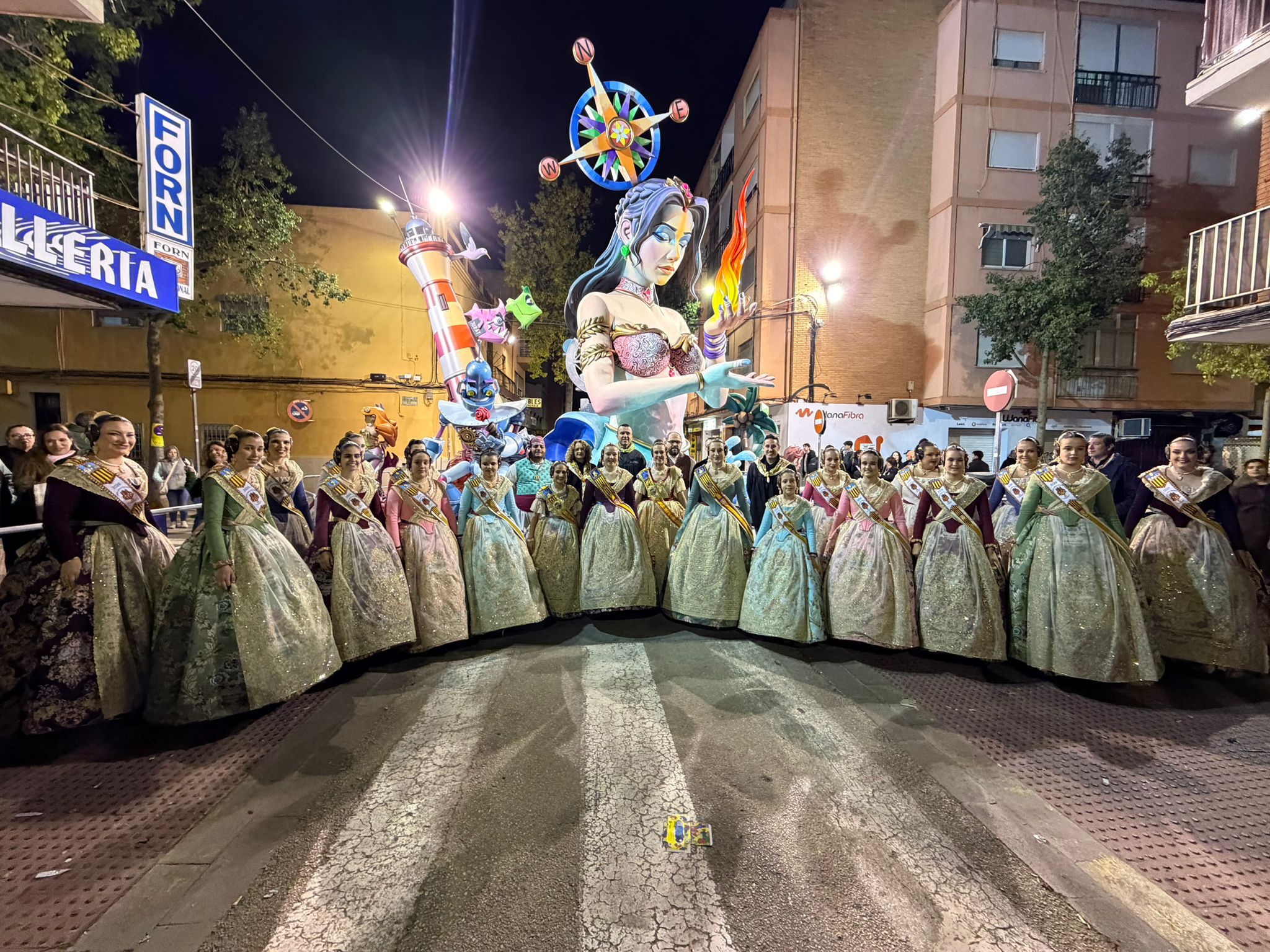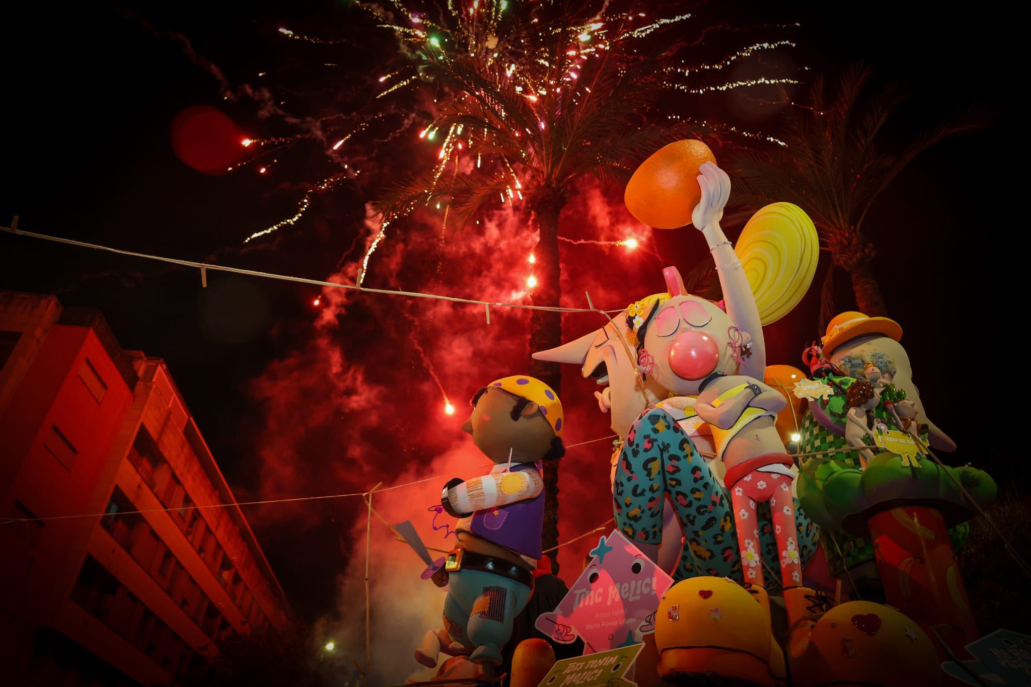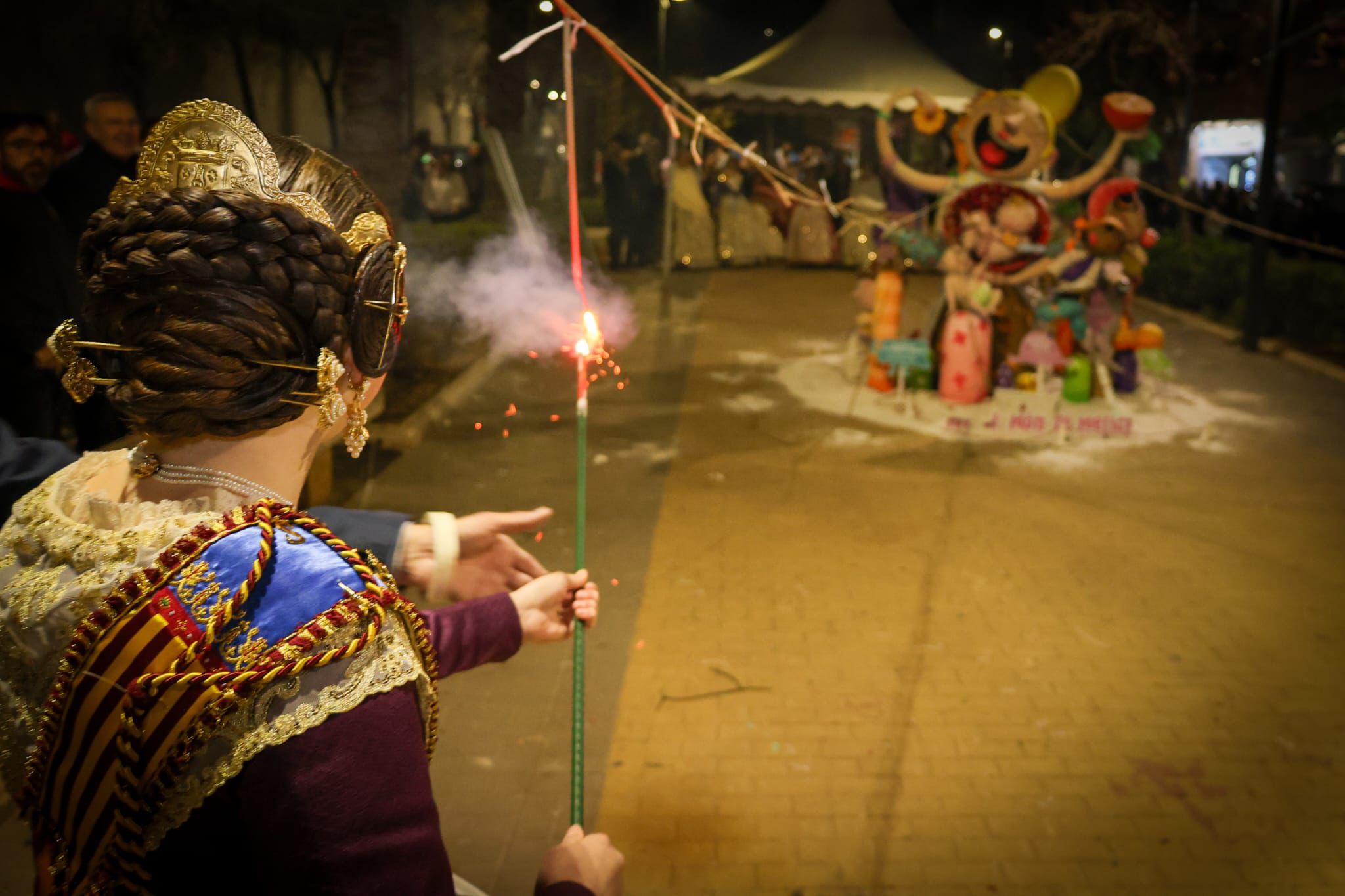 A medida que avanzaba la noche, el olor a madera quemada y el sonido de las carcasas envolvían los barrios de Torrent. Sin embargo, todas las miradas convergían en un punto crítico al llegar la medianoche. A las 00:00 horas, el fuego alcanzó la falla Ángel del Alcázar, la gran triunfadora de este ejercicio al alzarse con el primer premio de la Sección Especial mayor.