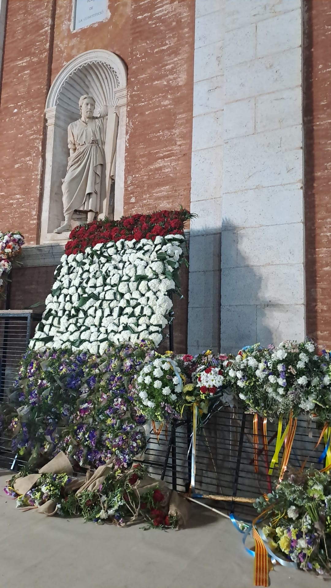 Desde las 18:30 horas, el color de los claveles y el sonido de las bandas de música han tomado el centro histórico en un desfile que ha congregado a las cinco comisiones del municipio, acompañadas por delegaciones invitadas de diversas Juntas Locales. El fervor se ha hecho tangible a la llegada de las falleras a la Plaza de la Constitución, donde el tapiz de la Virgen ha ido cobrando vida gracias a los ramos depositados por cientos de falleros y falleras de todas las edades.