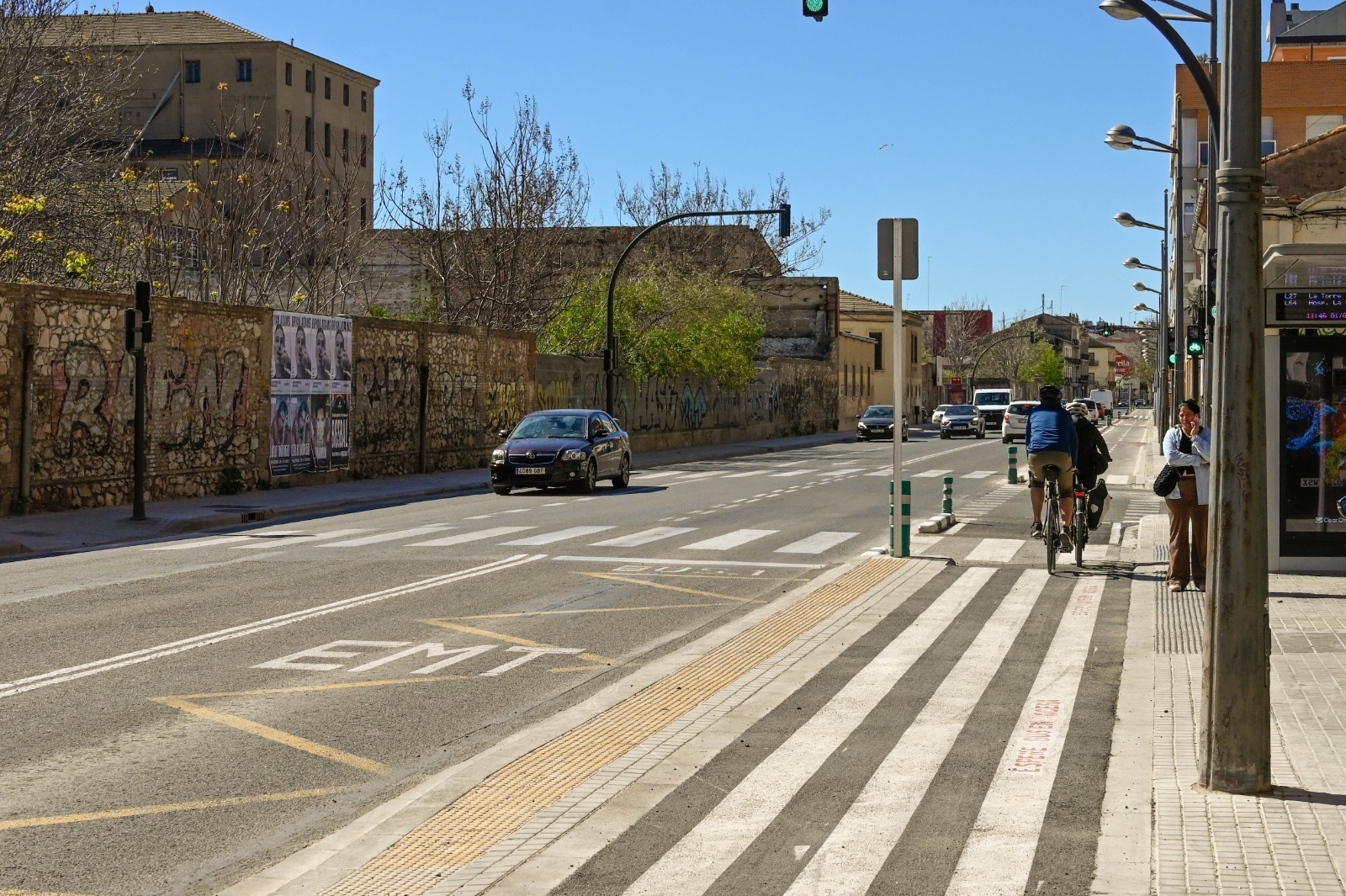 La finalización de la infraestructura ciclista en uno de los ejes principales del sur de la ciudad deja una asignatura pendiente: la seguridad y comodidad de los pasajeros de la EMT, que ahora deben cruzar el carril bici para acceder al transporte público.