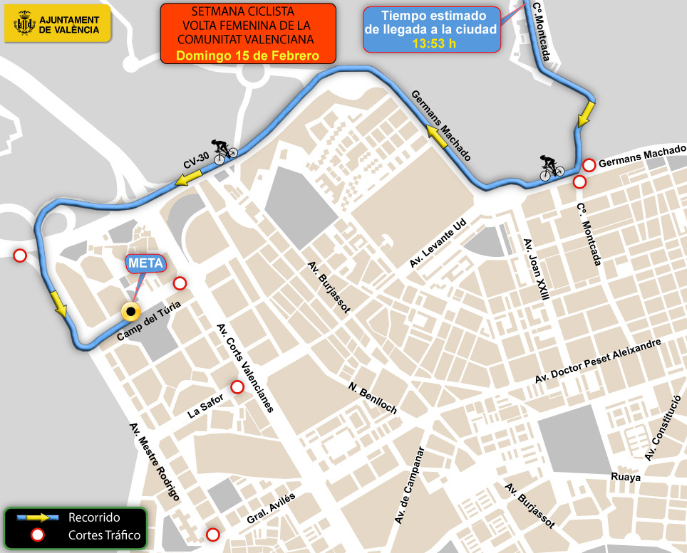 Para garantizar la seguridad y el montaje de la infraestructura de meta, la Avenida Camp de Túria estará cerrada al tráfico entre las avenidas Corts Valencianes y Mestre Rodrigo desde las 06:30 hasta las 20:30 horas. Los vecinos de Beniferri contarán con un carril habilitado para entrar y salir del barrio.