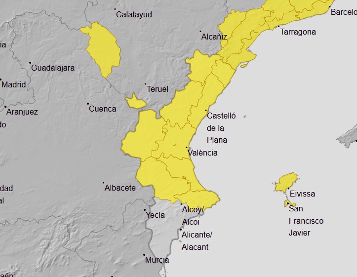 - Castelló: Mantiene el aviso amarillo por lluvias que pueden acumular hasta 30 litros por metro cuadrado en una hora u 80 litro en 12 horas. Lo mantiene hasta las 12:00h del mediodía en el que se desactiva el aviso amarillo.