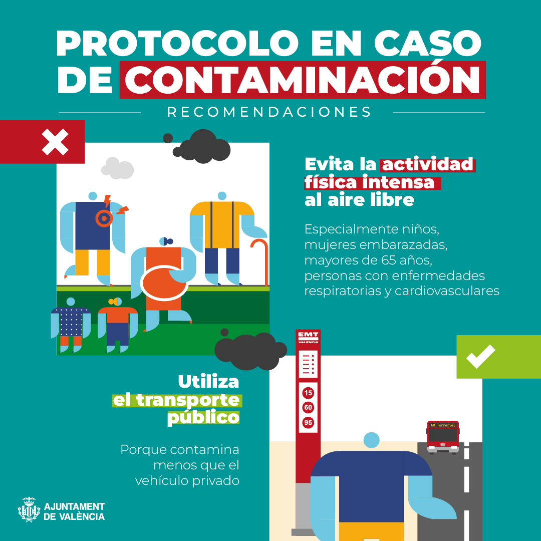 El Ayuntamiento ha lanzado una guía de recomendaciones para intentar frenar la contribución local a este episodio. En el ámbito de la movilidad, el mensaje es claro: priorizar el transporte público. El uso de la red de la EMT y Metrovalencia se presenta como la alternativa más sostenible frente al vehículo privado. En caso de ser imprescindible el uso del coche, se pide compartir el vehículo para reducir el número de desplazamientos y practicar una conducción eficiente, evitando los acelerones bruscos.