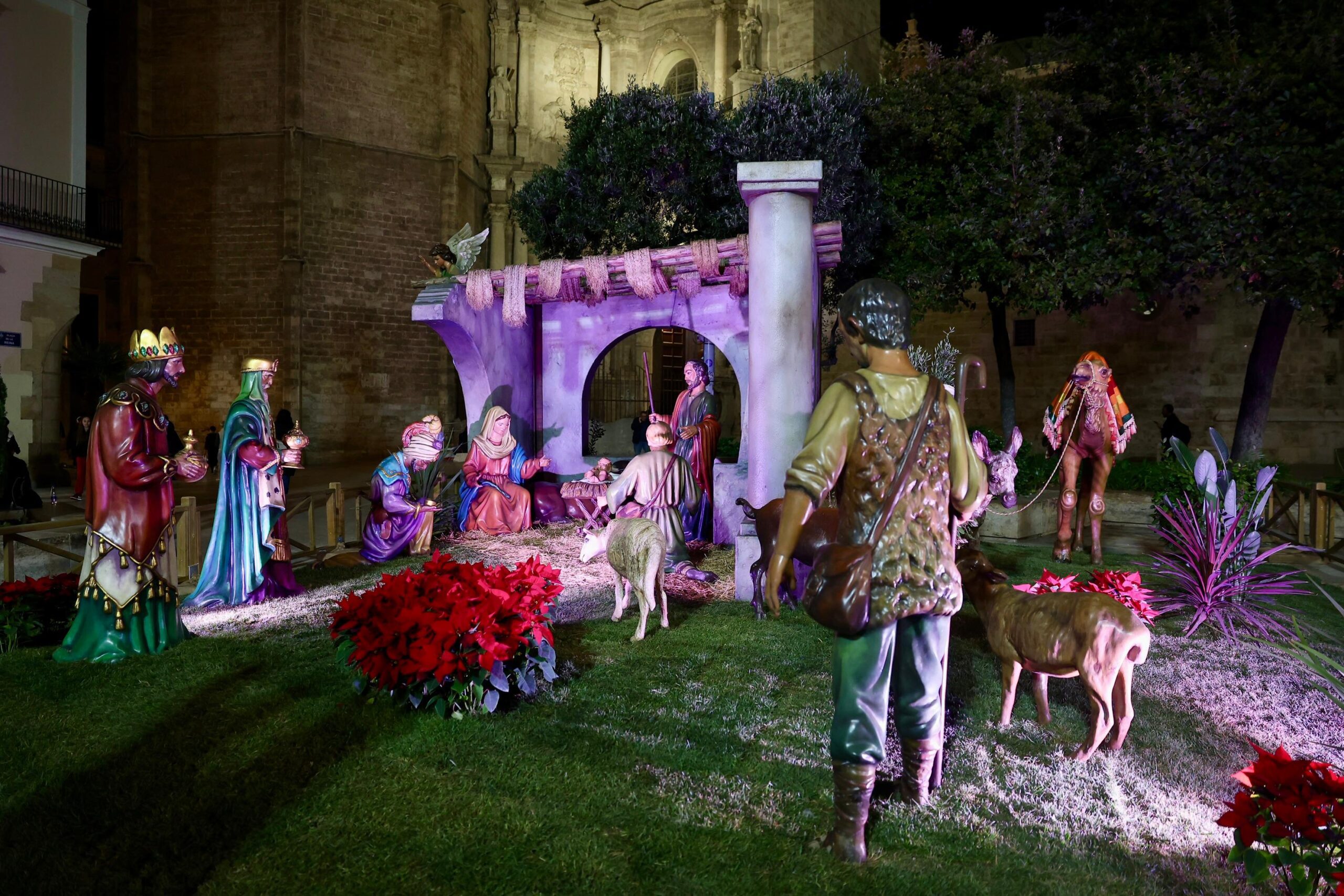 Finalmente, la plaza de la Reina alberga también un Belén monumental a tamaño natural compuesto por figuras donadas por el Gremio de Artistas Falleros, que han sido transformadas por las artistas María Pilar y María José Luna, hijas del maestro Vicente Luna. En conjunto son más de una decena de piezas que recrean la escena del Nacimiento, el Ángel Anunciador y la Adoración de los Reyes y los pastores, configurando una estampa navideña de gran formato.