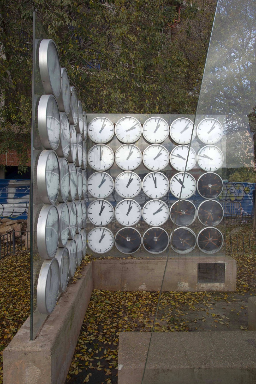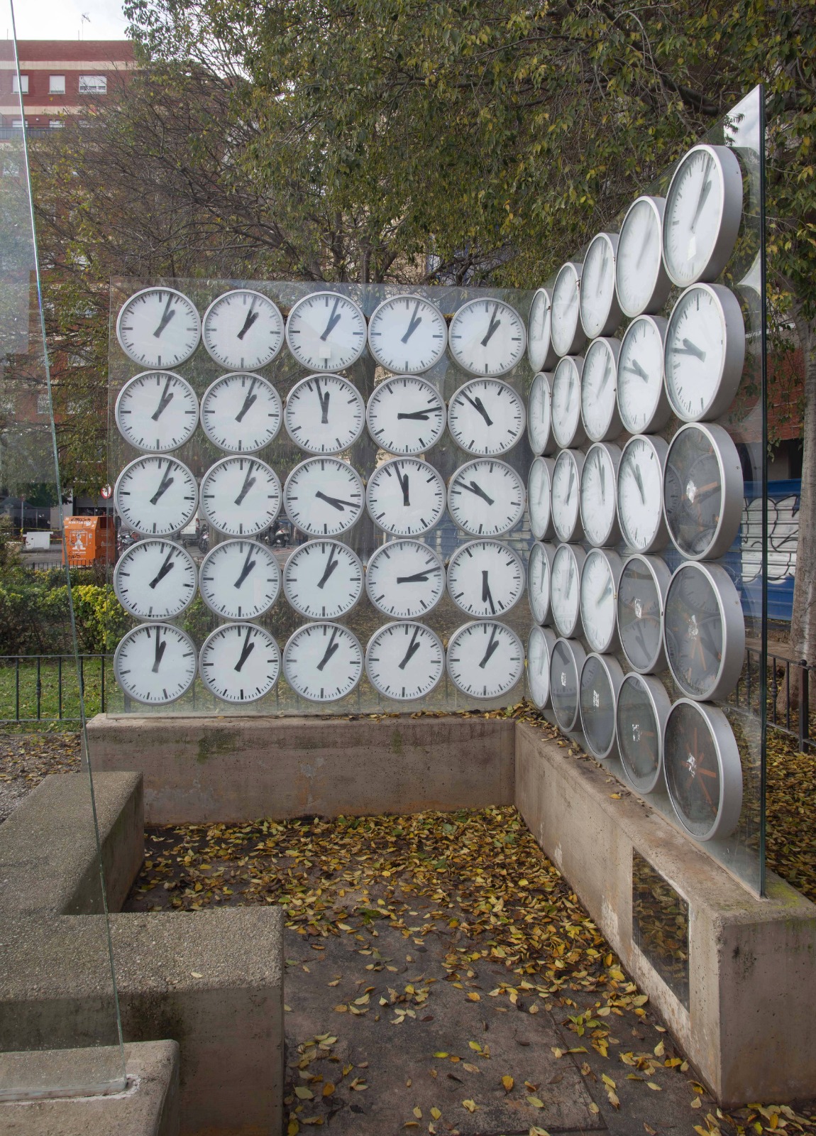 El monumento no es una pieza escultórica convencional; es un complejo sistema de relojería y vidrio valorado en 18.500 euros. Se compone de cuatro tabiques de vidrio laminado dispuestos sobre muretes de hormigón. Su esencia reside en 43 relojes blancos —uno por cada vida segada— cuyas manecillas quedaron fijadas en las 13:03 horas, el instante preciso del descarrilamiento. Acompañan a estos otros siete relojes negros, que representan a los heridos graves.