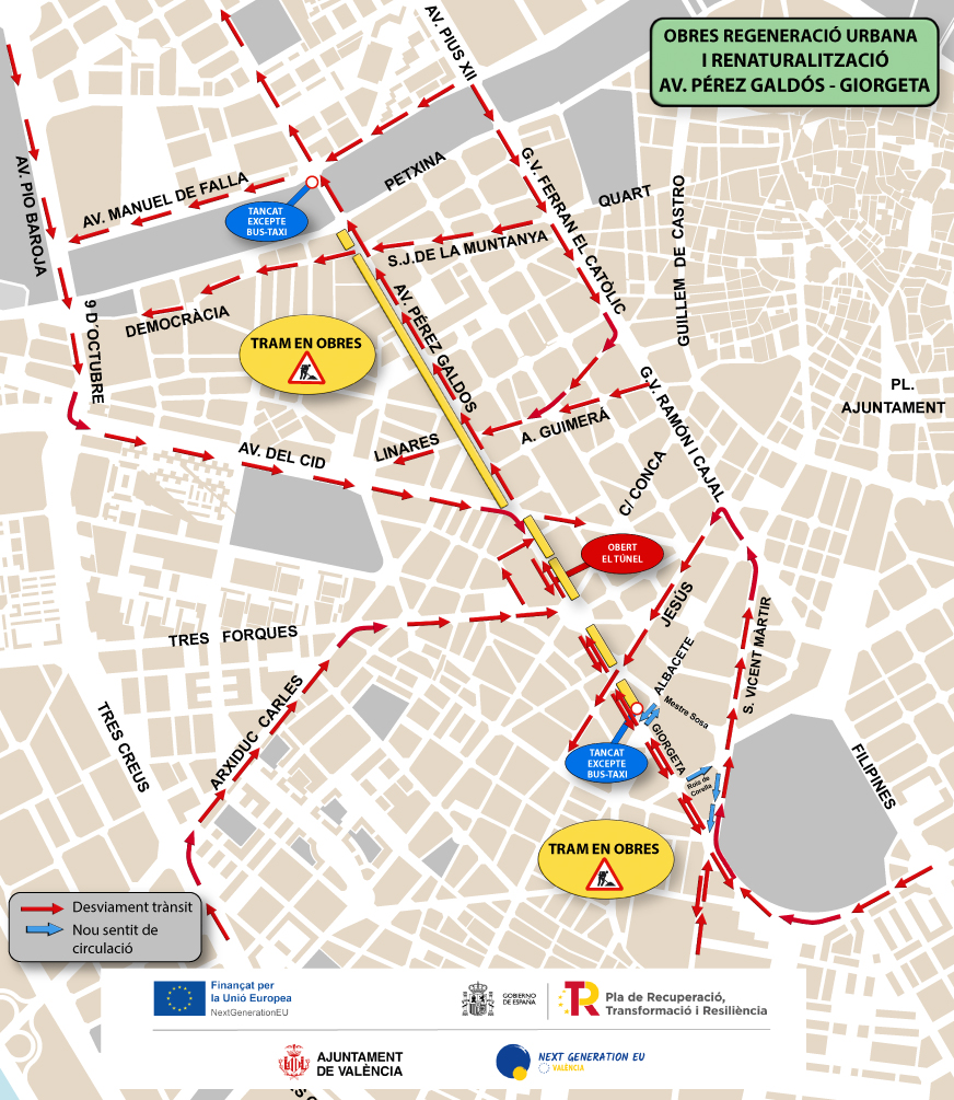 Calle San Vicente Mártir: Se ha habilitado un nuevo carril en dirección sur, específicamente en el tramo que va desde la calle Roís de Corella hasta la avenida de la Giorgeta. Este nuevo carril está diseñado para descongestionar uno de los puntos con mayor densidad de tráfico de la zona.