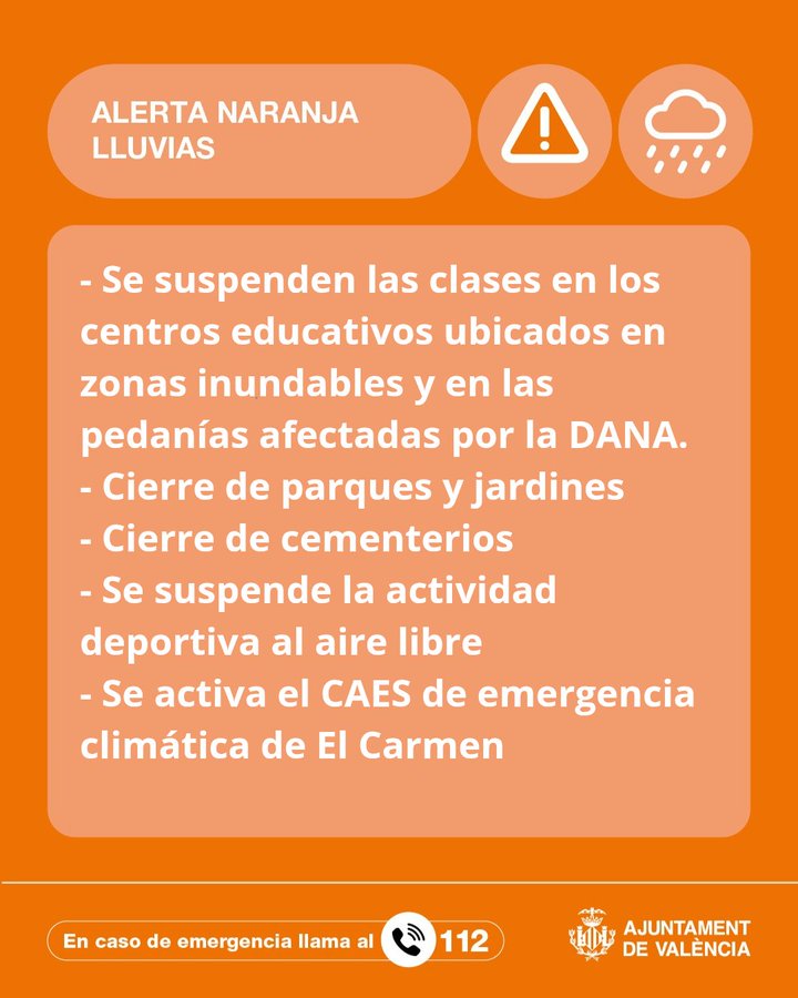 Se recomienda hacer seguimiento de las alertas a través de los canales oficiales de comunicación del Ayuntamiento de Valencia, en el que se actualizará toda la información.