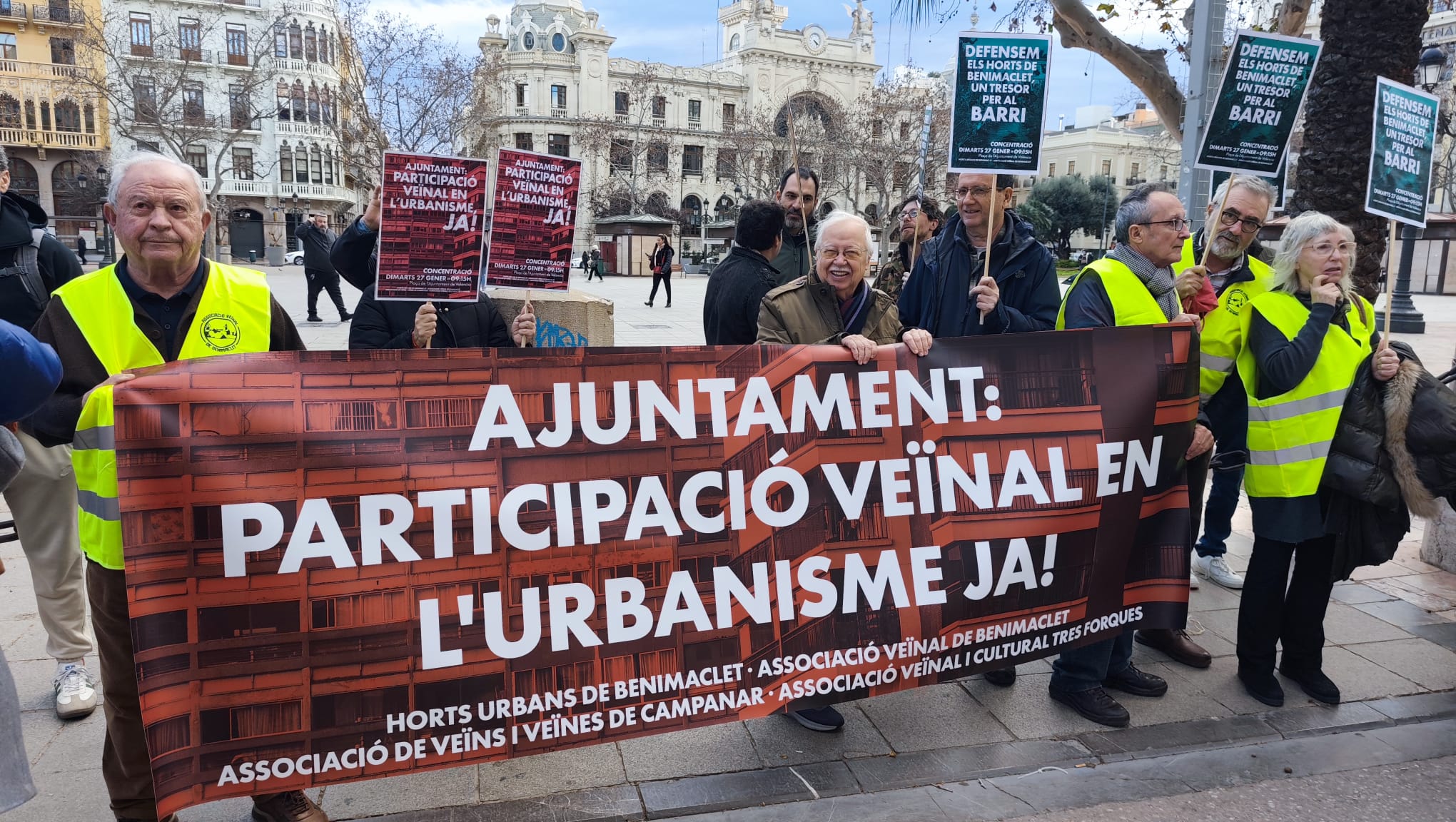 Hasta tres asociaciones vecinales, la AA.VV. de Benimaclet, la AA.VV. de Campanar y la AA.VV. de Tres Forques unidos a la asociación de huertos urbanos de Benimaclet se han concentrado hoy frente a la fachada principal de la Casa Consistorial de Valencia, y a ellos se une la Asociación de Amics del Carme que se concentró ayer.