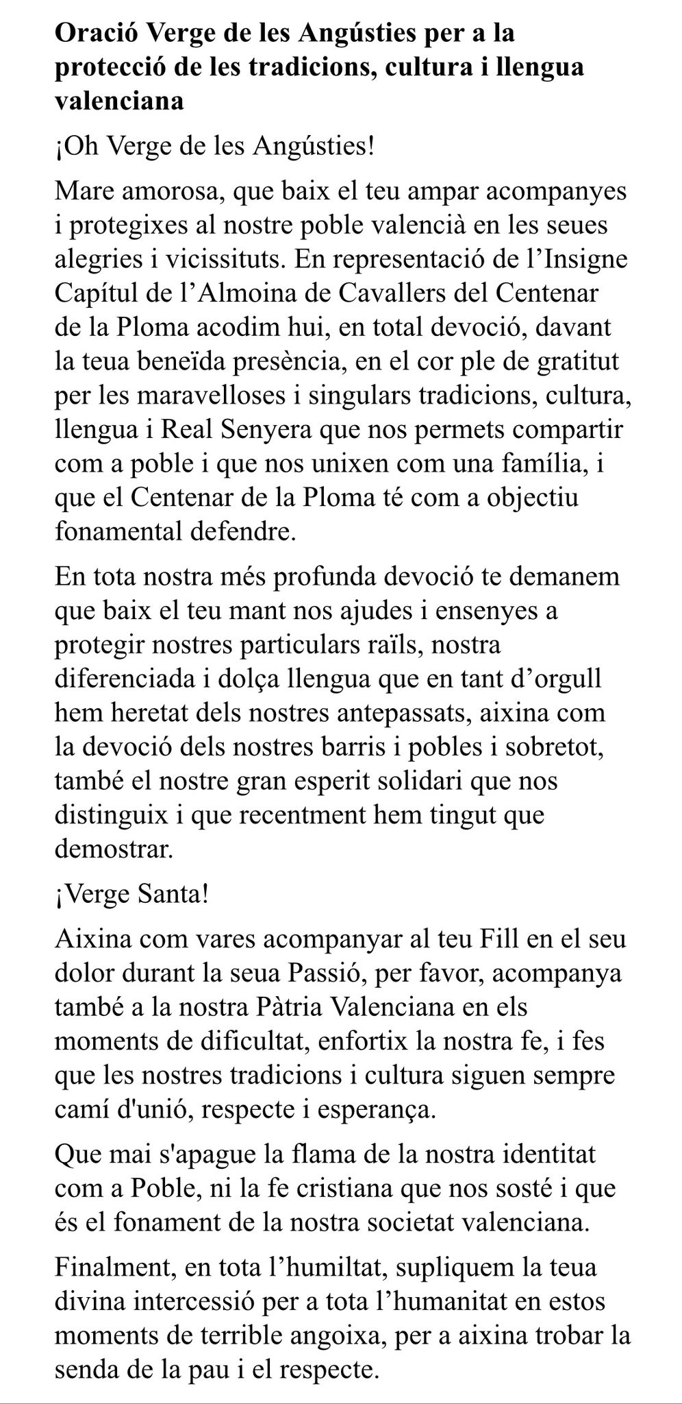En l’oració de Dolors, el Centenar ha demanat a la Verge de les Angústies per a que nos ajude a mantindre i defendre les nostres tradicions, cultura, diferenciada llengua i Real Senyera, com una part fonamental de la nostra Pàtria Valenciana.